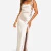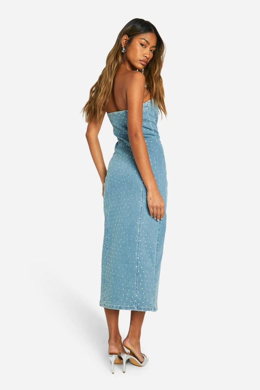 BOOHOO Bandeau Diamante Thigh Split Denim Maxi Dress