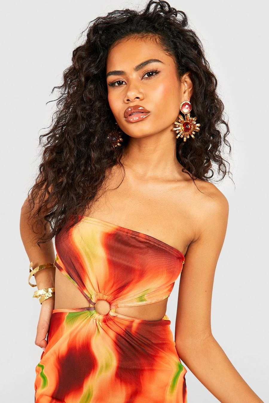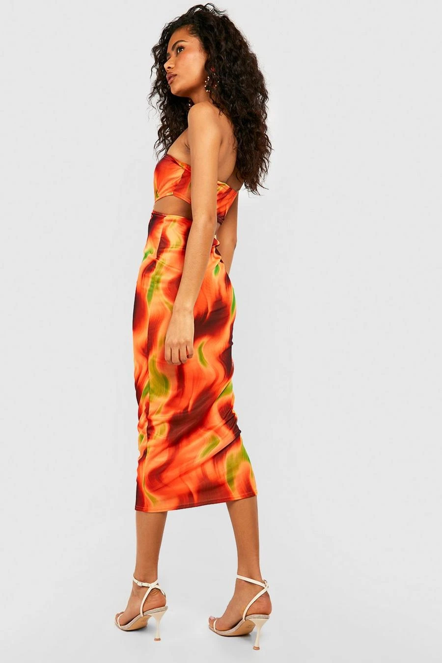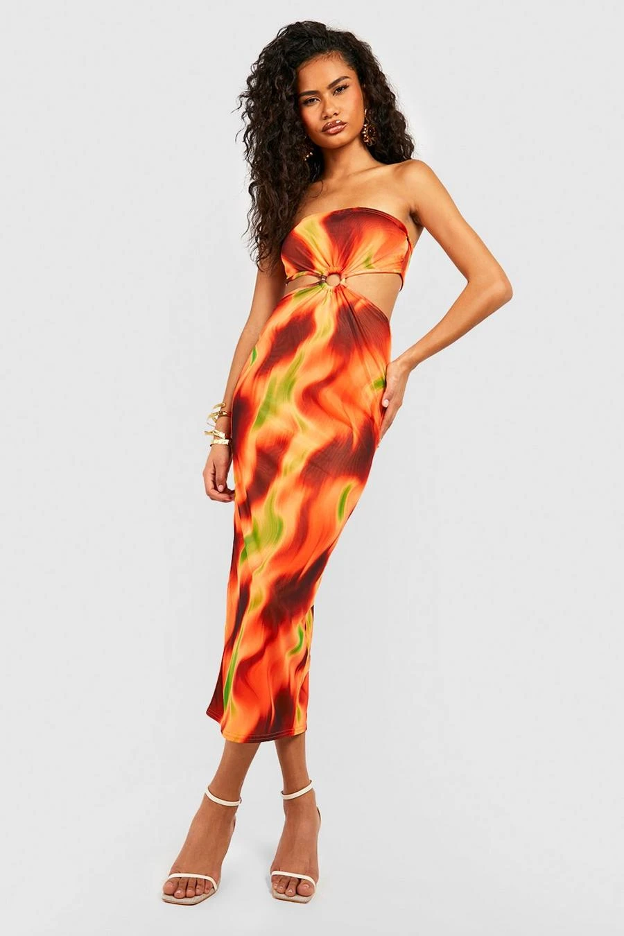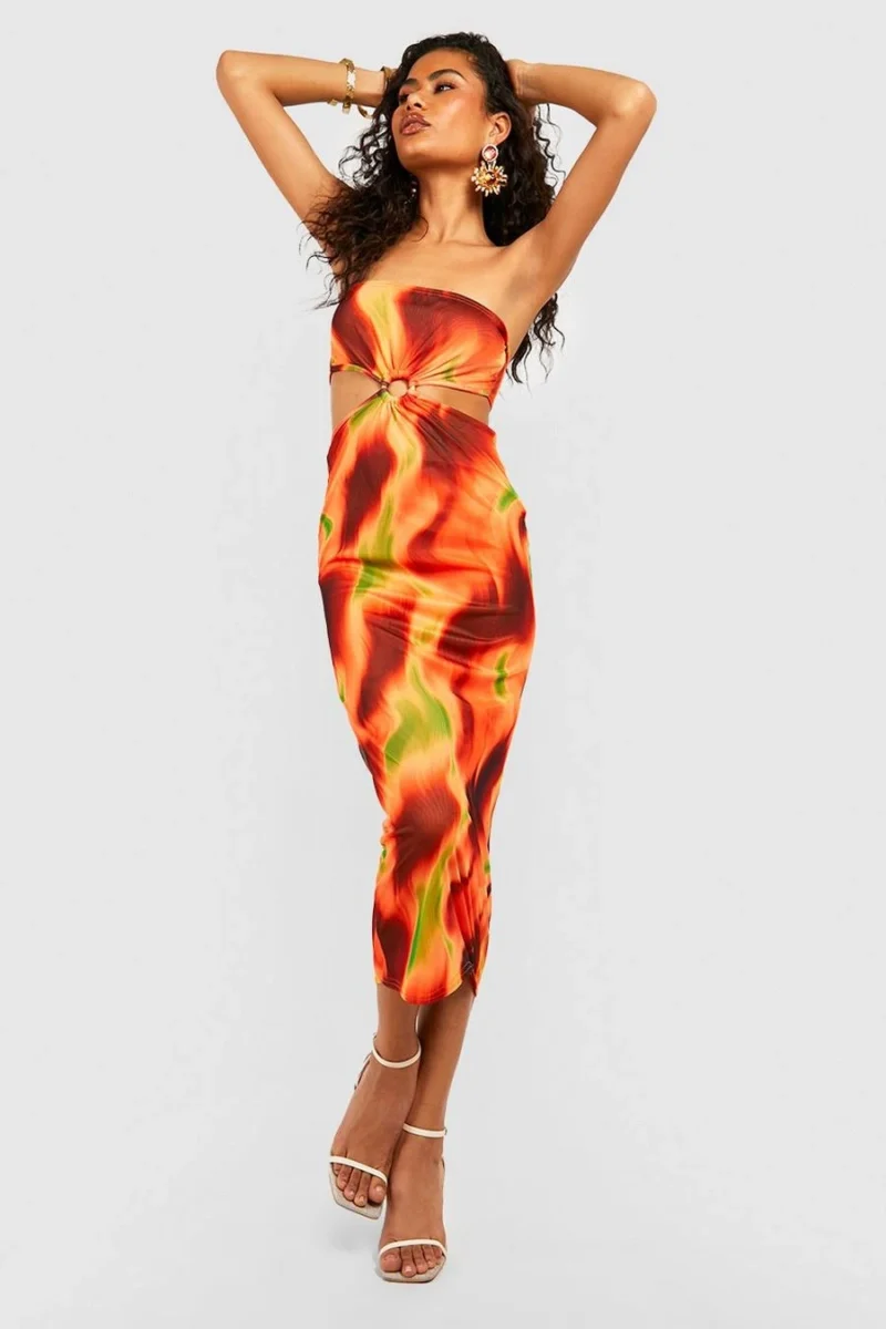BOOHOO Bandeau O Ring Cut Out Printed Mesh Midaxi Dress