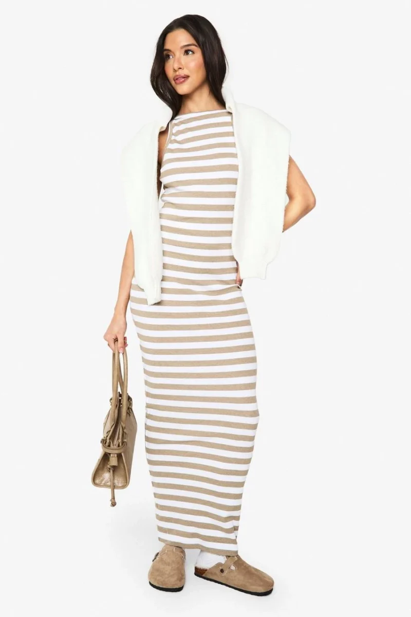 BOOHOO Basic Stripe Rib Racer Neck Maxi