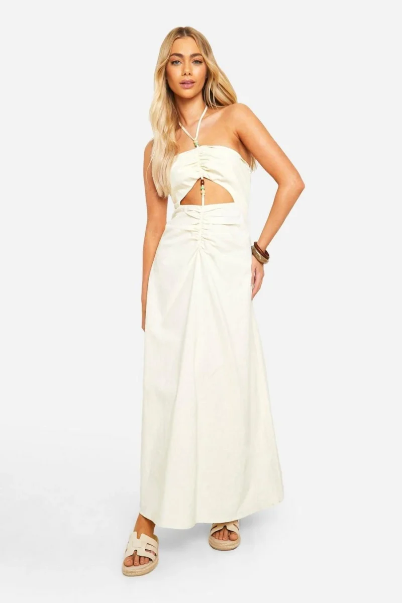 BOOHOO Bead Detail Ruched Linen Look Maxi Dress