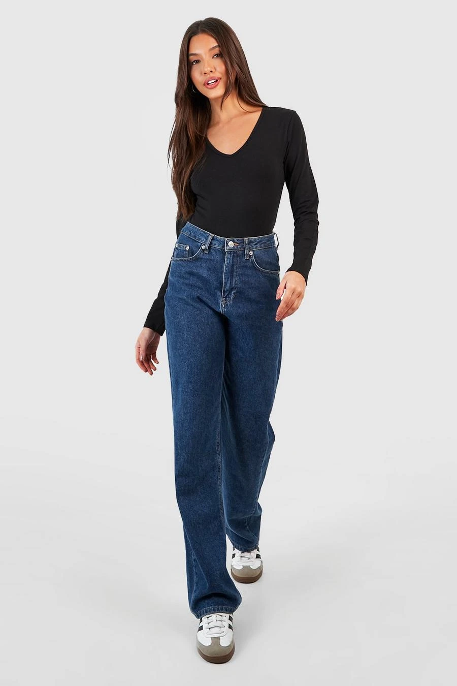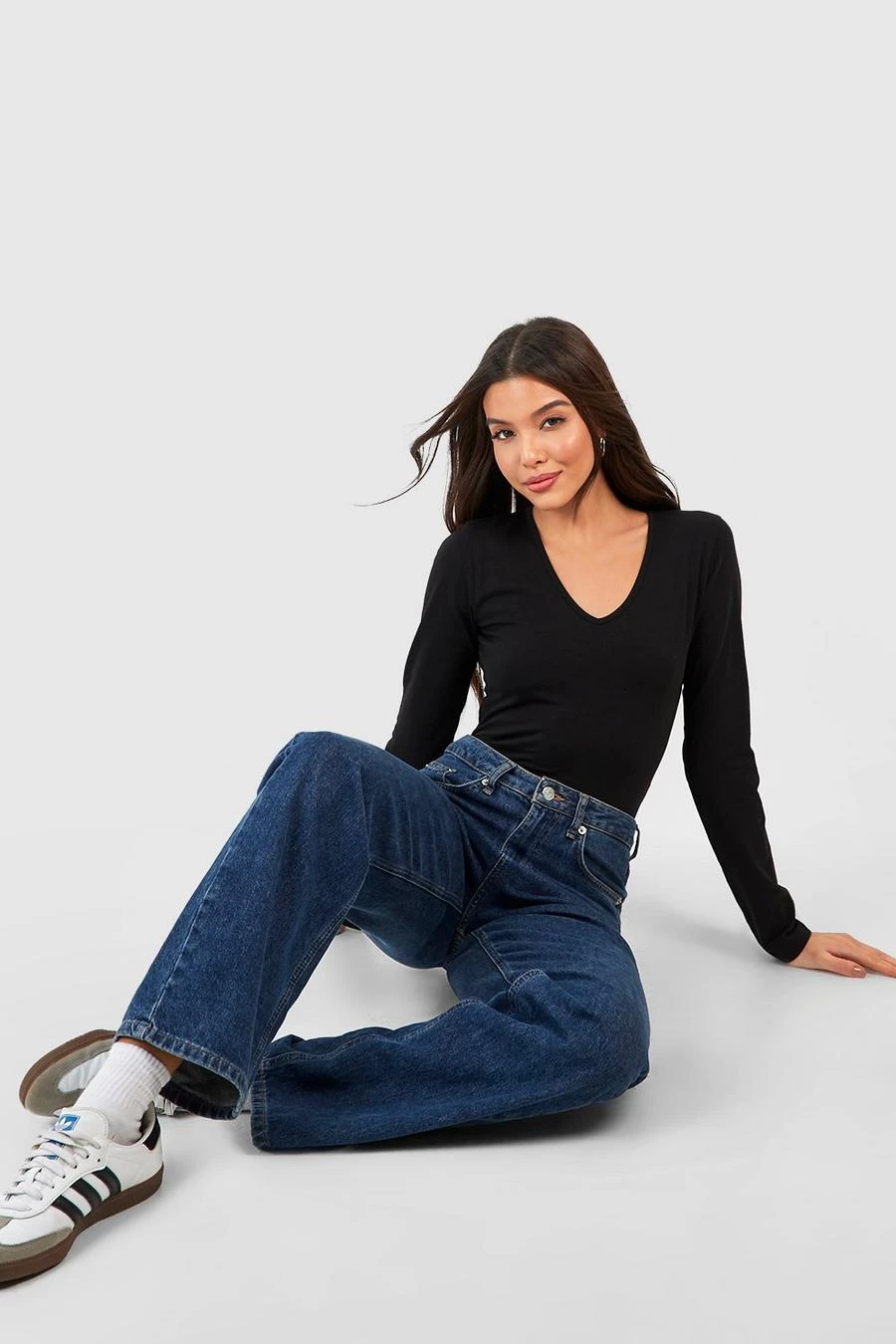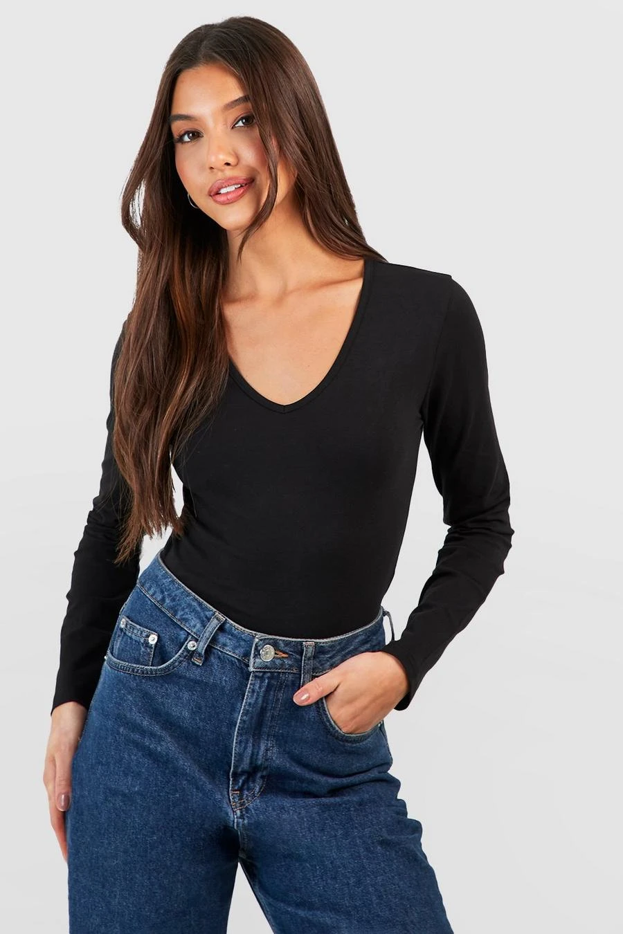 BOOHOO Black Long Sleeve V Neck Cotton Blend Bodysuit