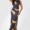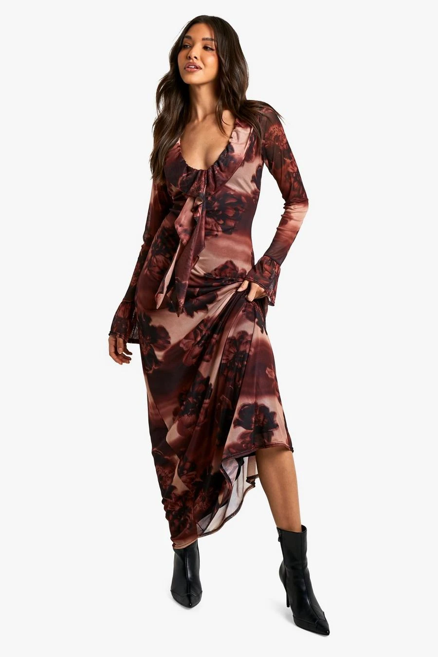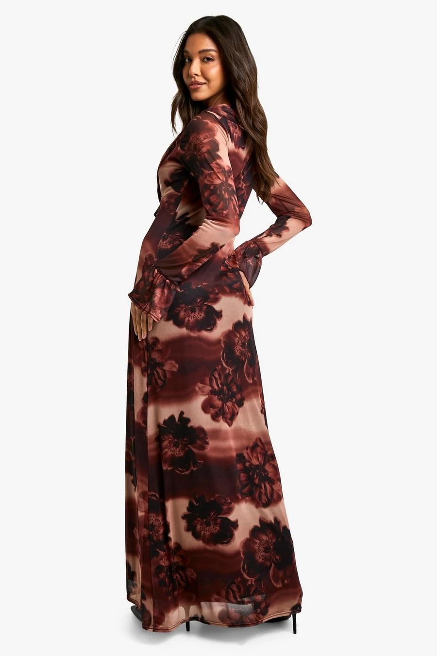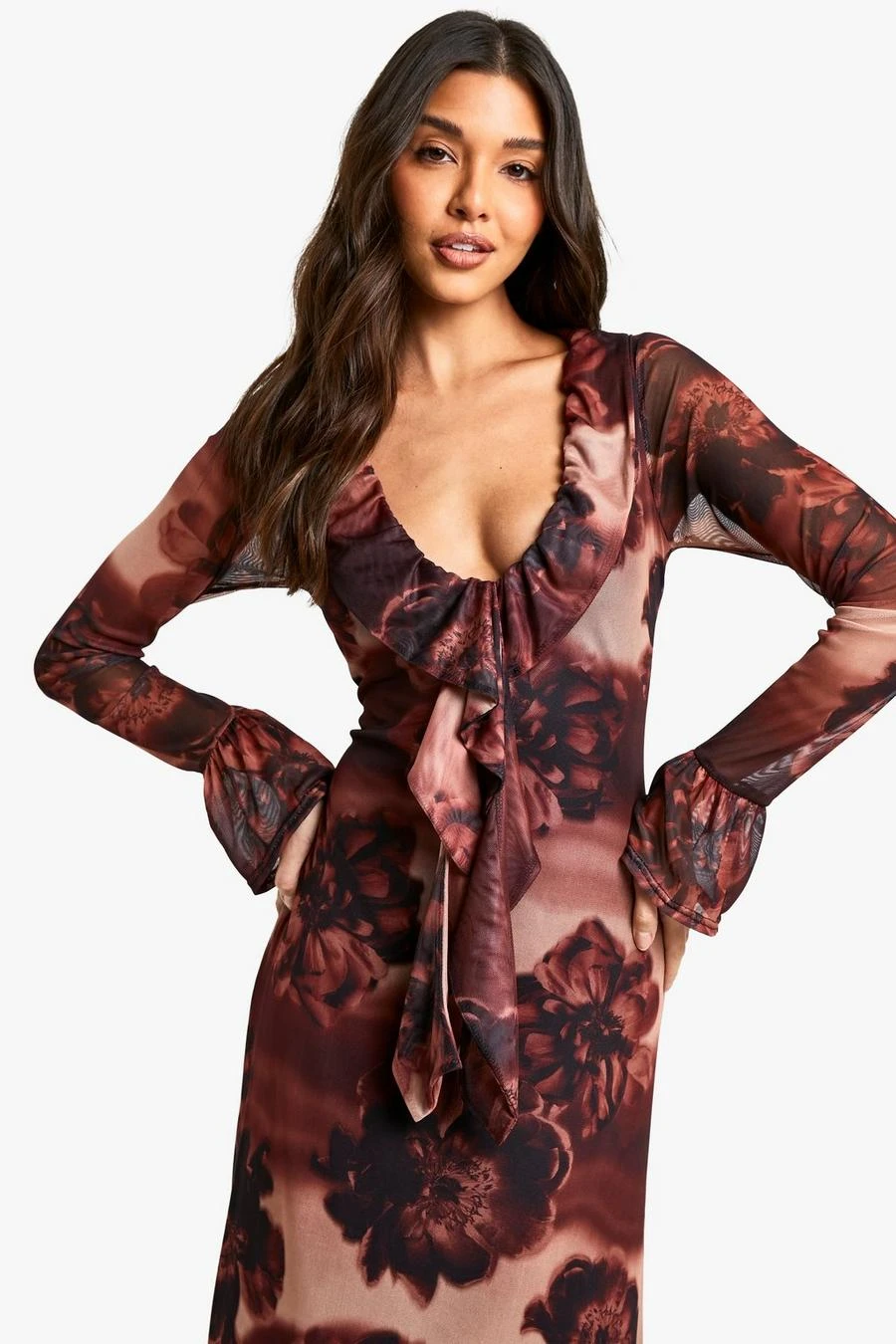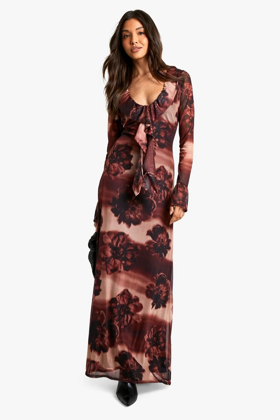 BOOHOO Blurred Floral Mesh Ruffle Maxi Dress