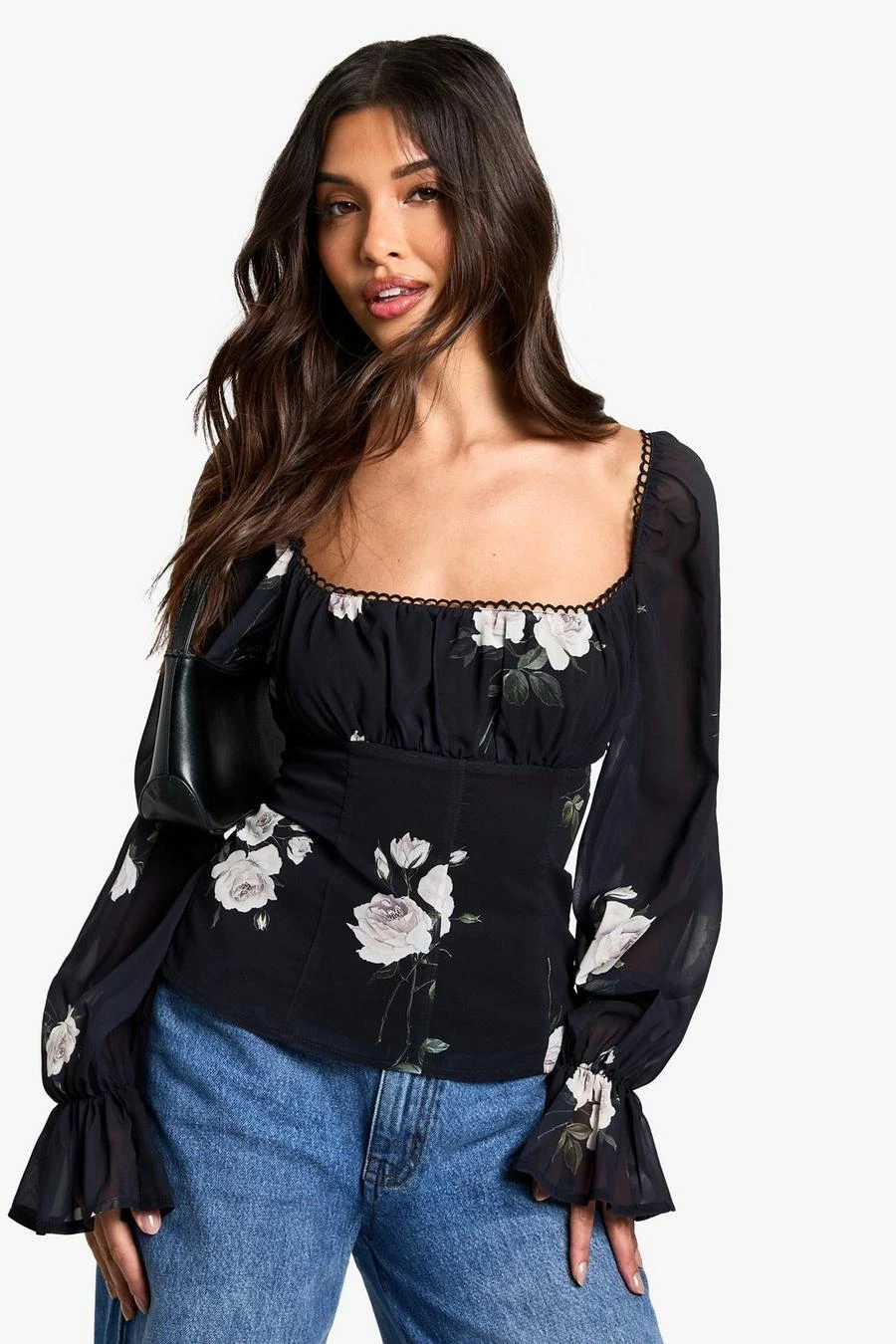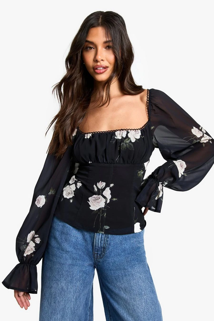BOOHOO Blurred Floral Print Ruched Corset Bust Woven Blouse