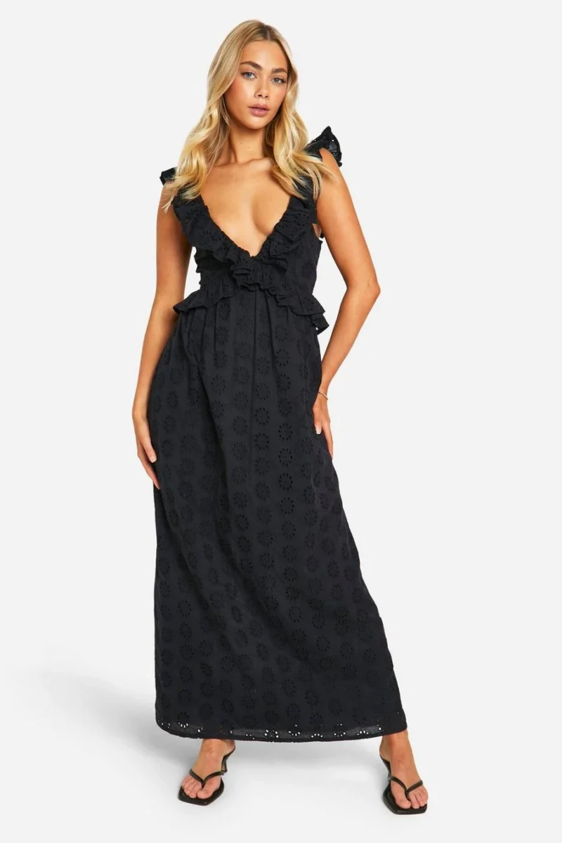 BOOHOO Broderie Ruffle Plunge Maxi Dress