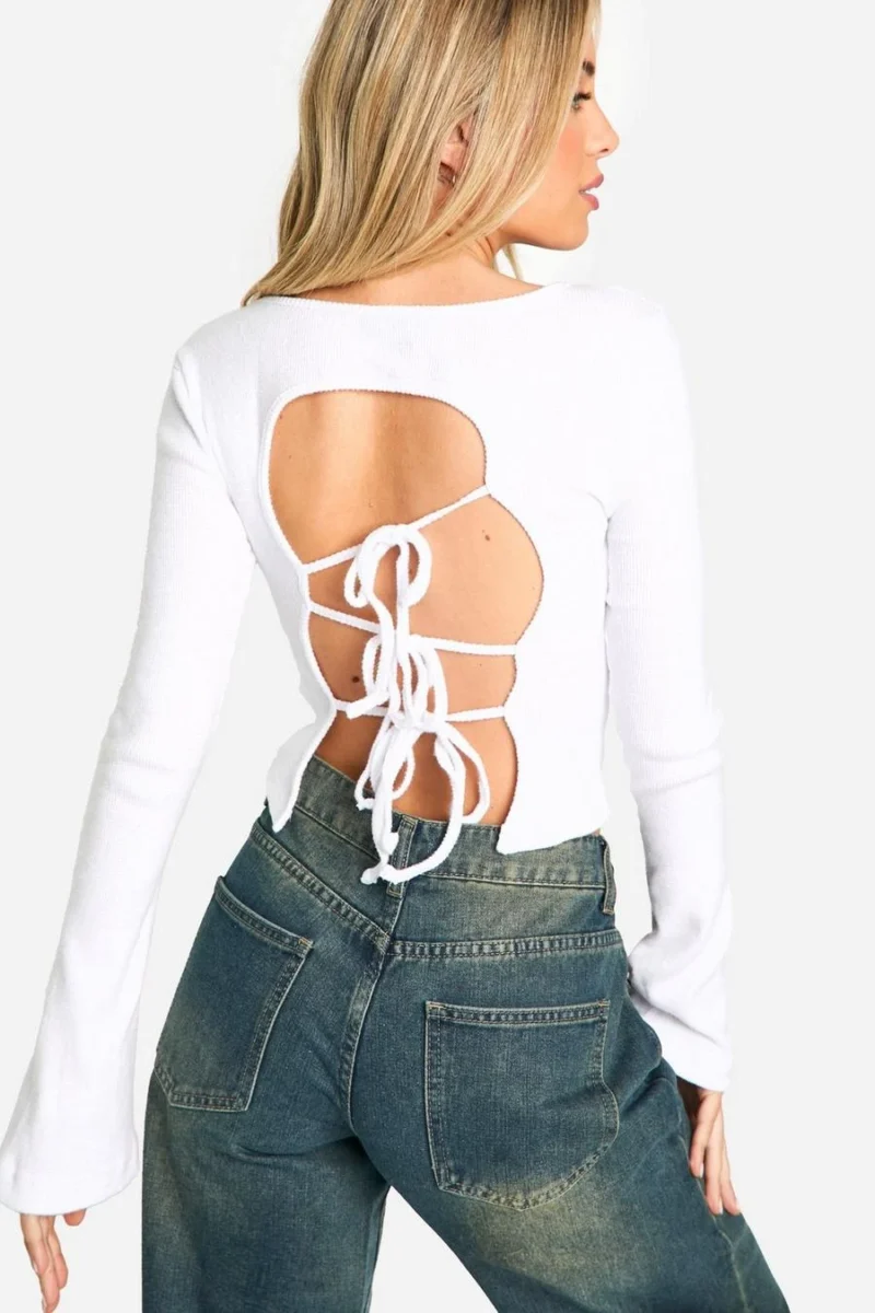 BOOHOO Brushed Rib Tie Back Detail Long Sleeve Top