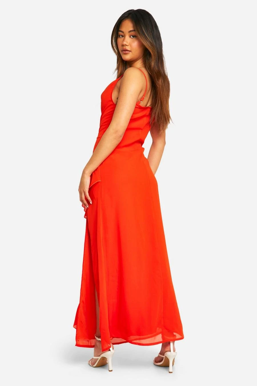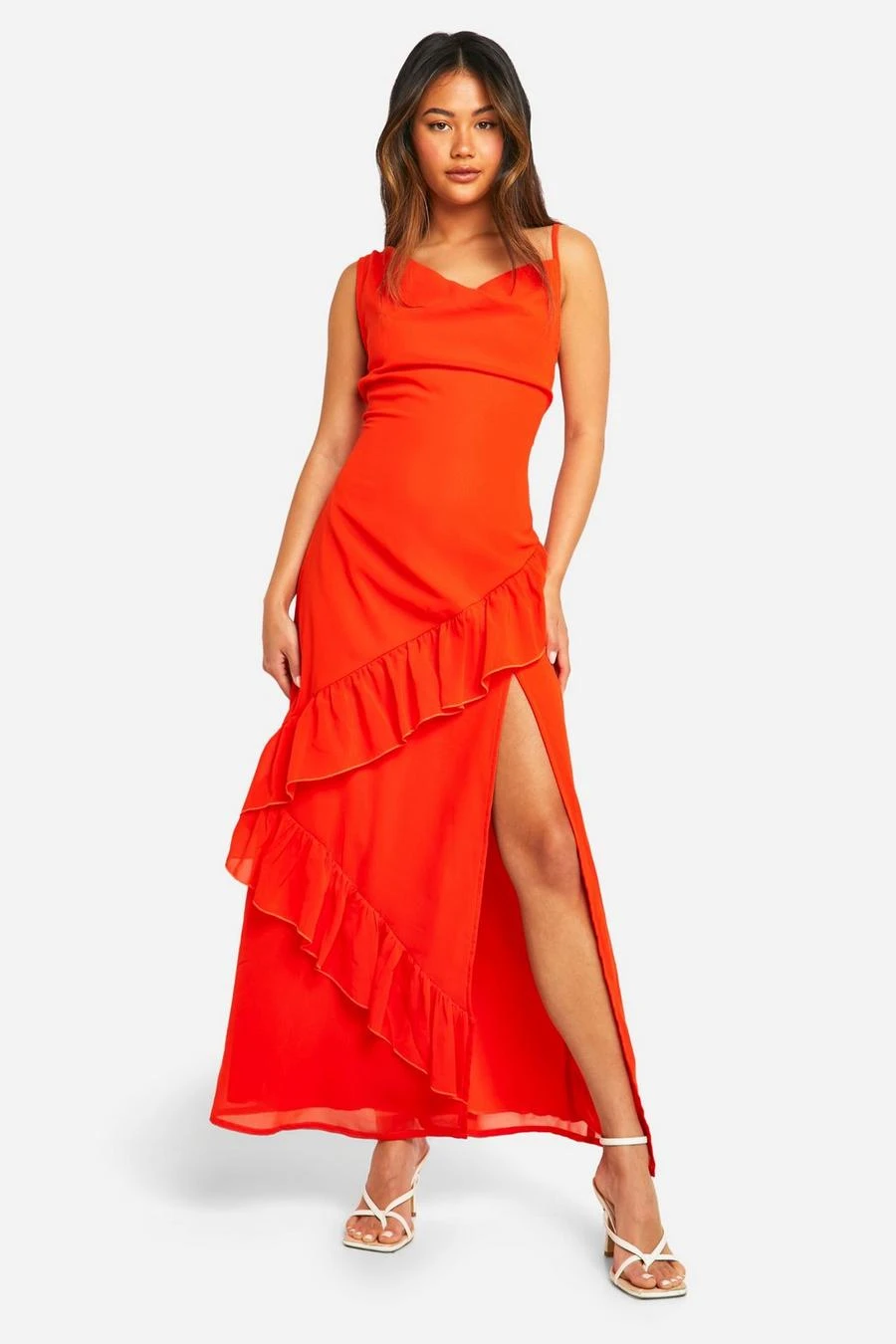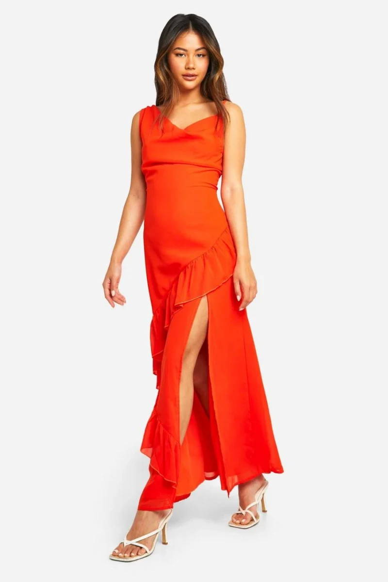BOOHOO Chiffon High Split Ruffle Maxi Dress