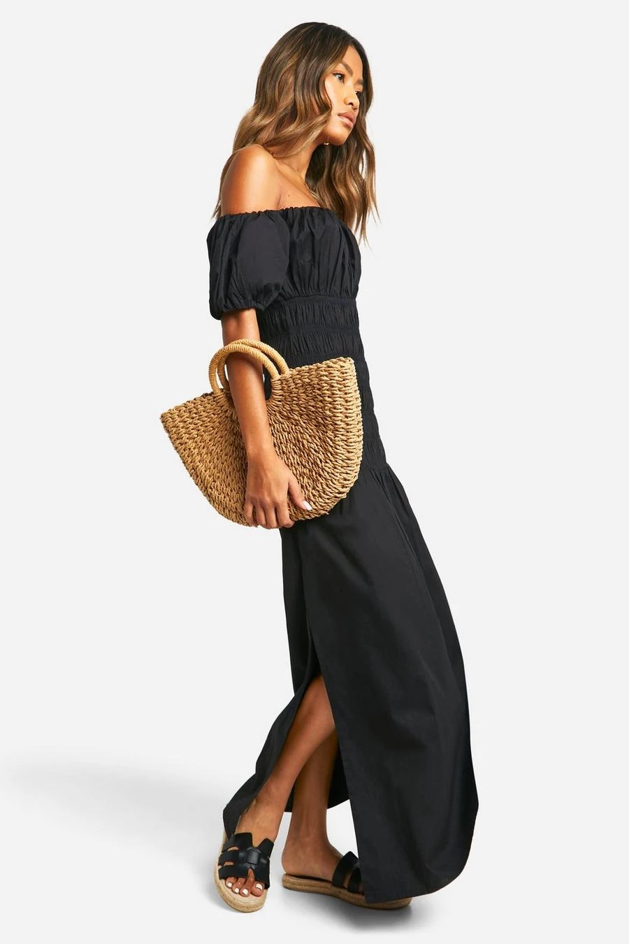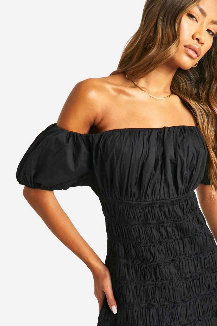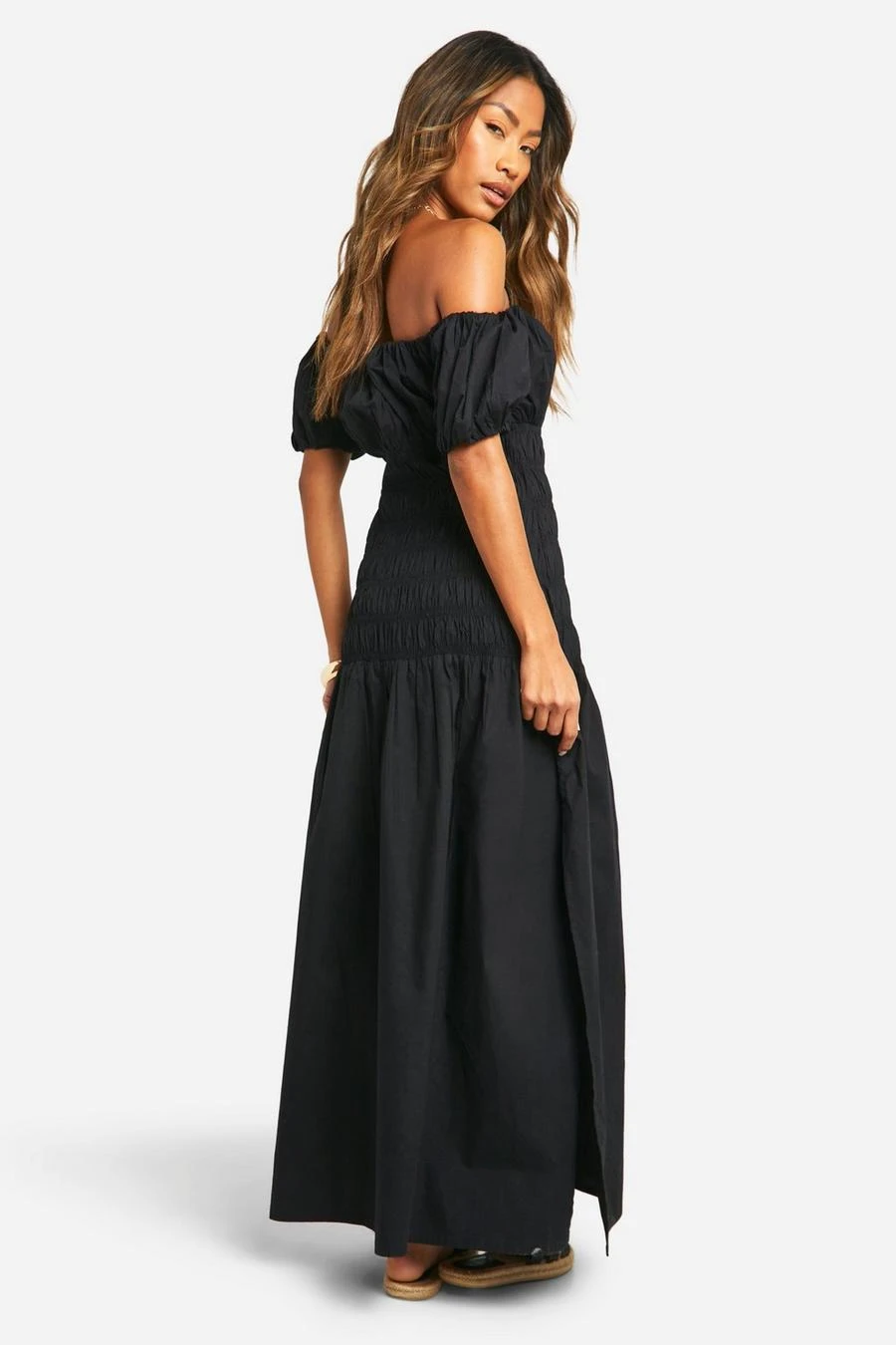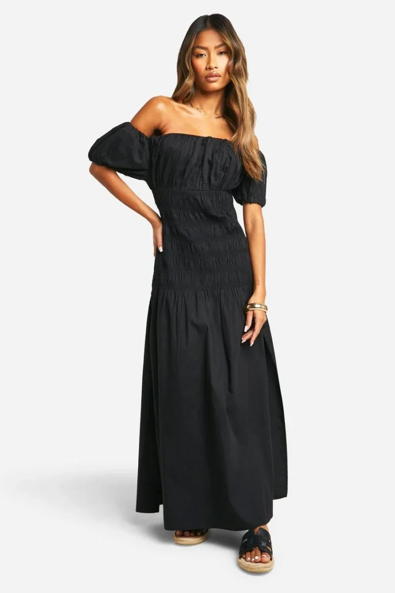 BOOHOO Cotton Poplin Shirred Puff Sleeve Maxi Dress