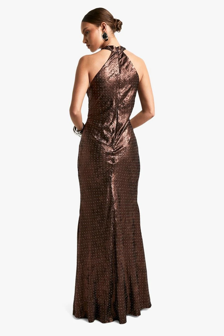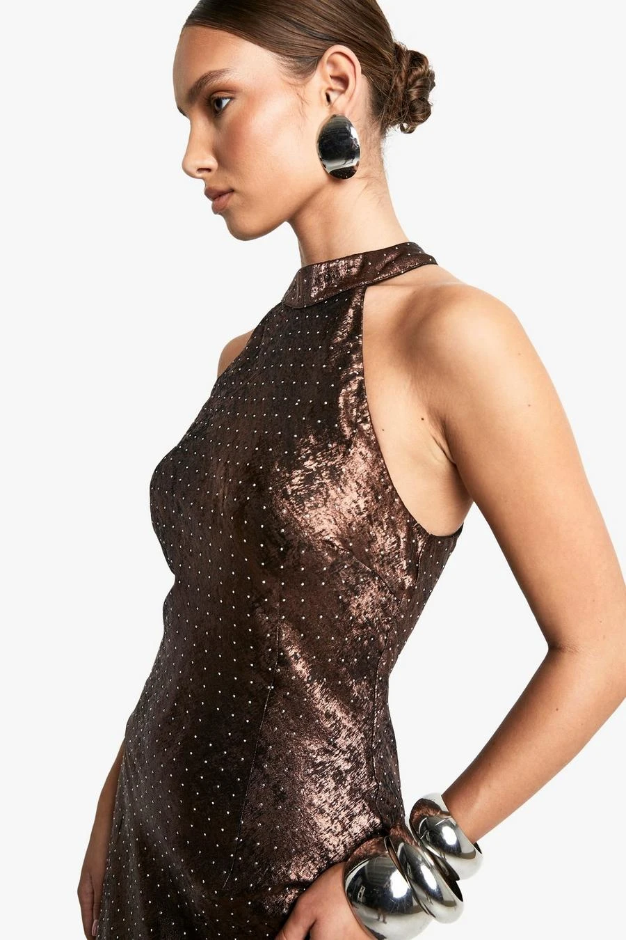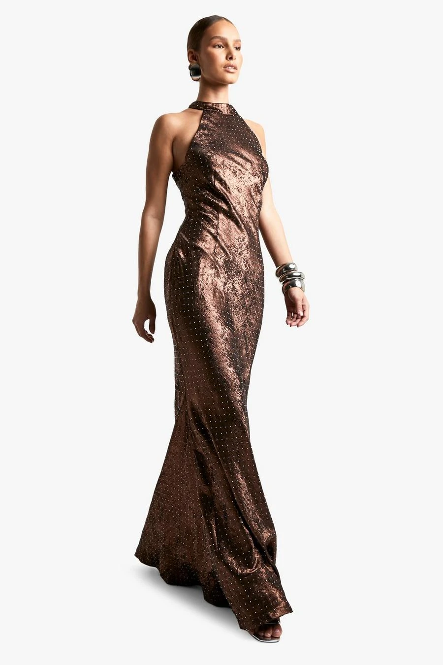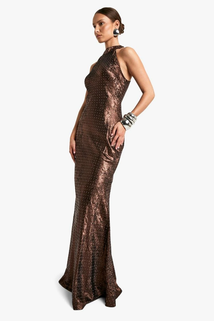 BOOHOO Cowl Neck Satin Diamante Halterneck Maxi Dress