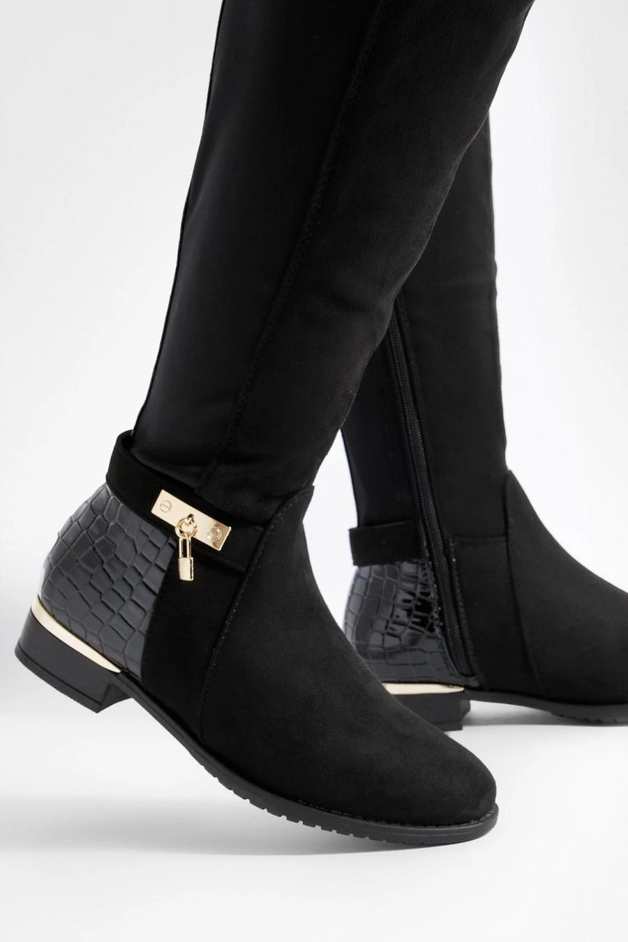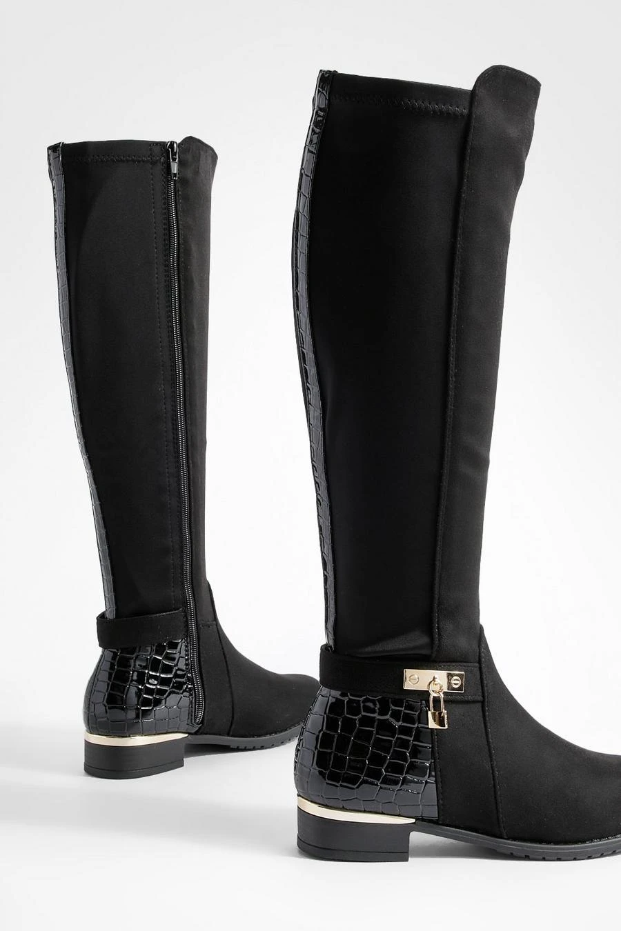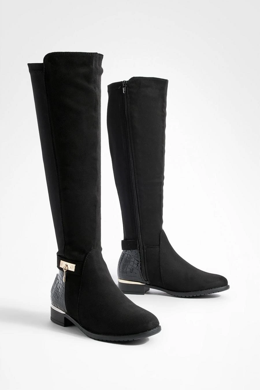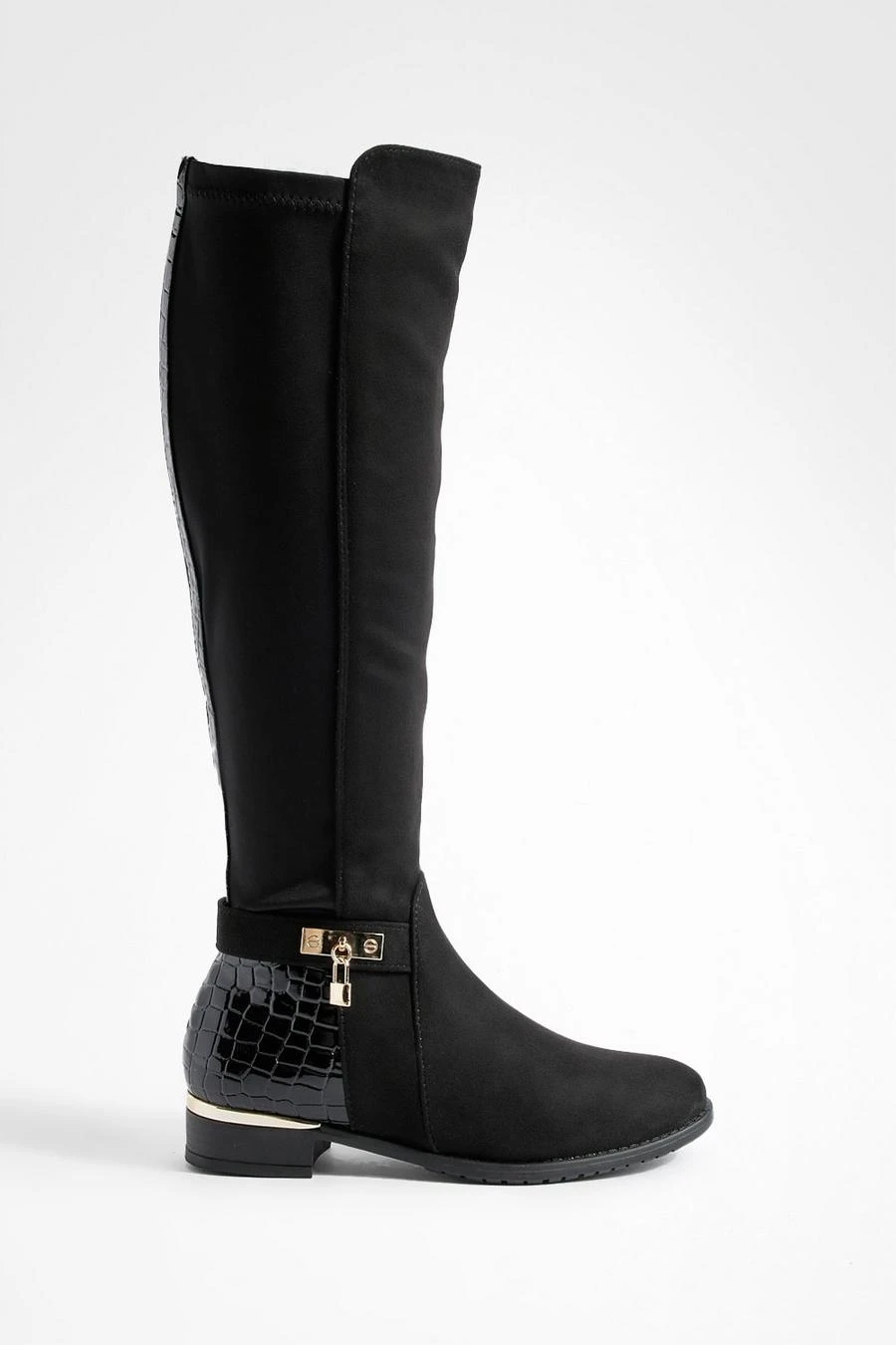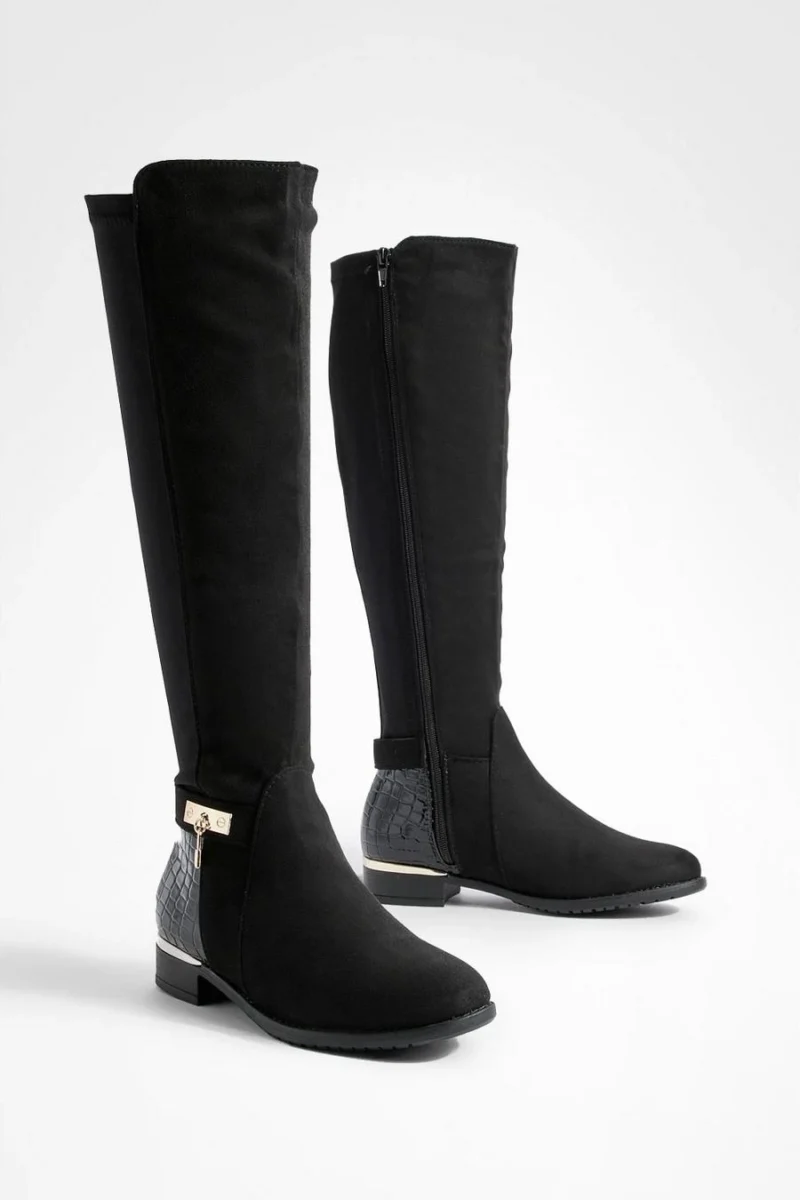 BOOHOO Croc Flat Faux Suede Knee High Boots