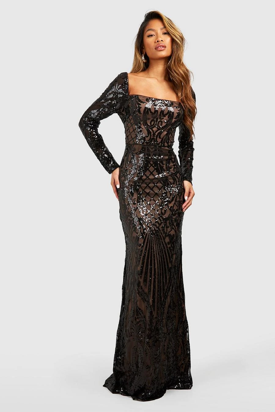 BOOHOO Damask Sequin Fishtail Maxi Party Dress