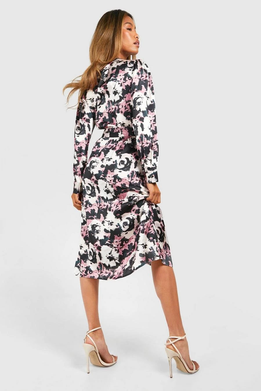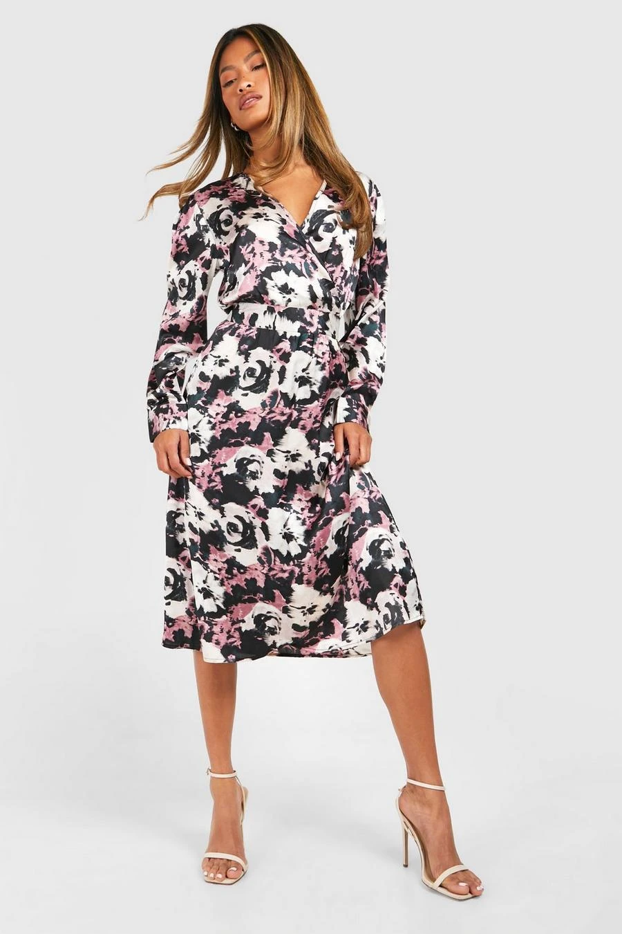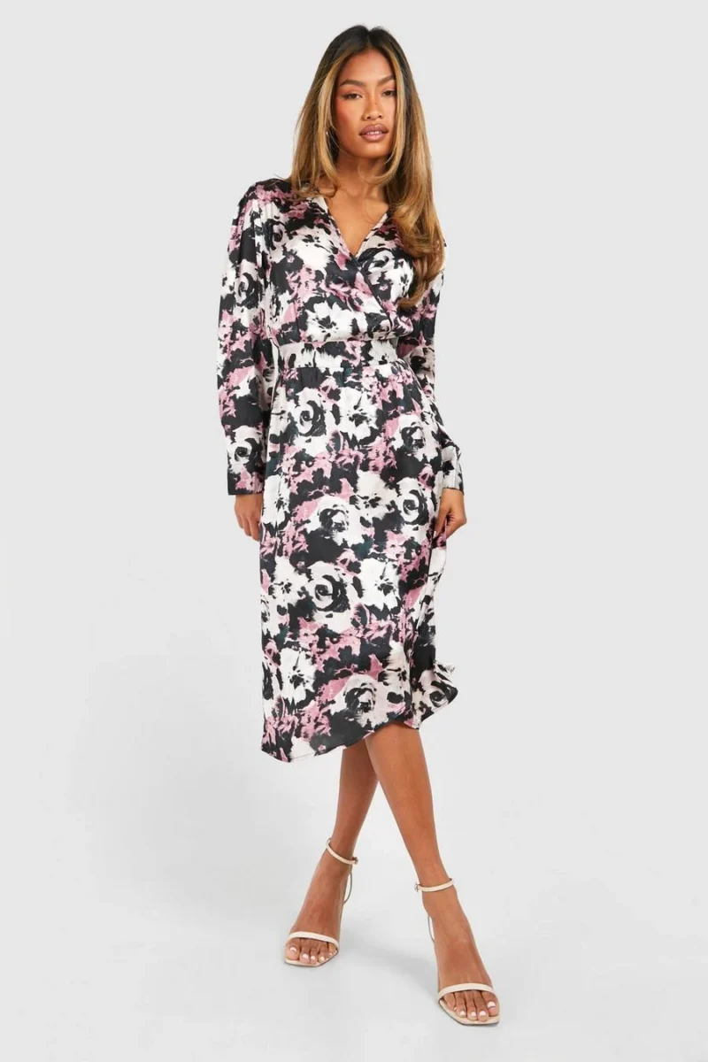 BOOHOO Dark Floral Satin Wrap Midi Dress