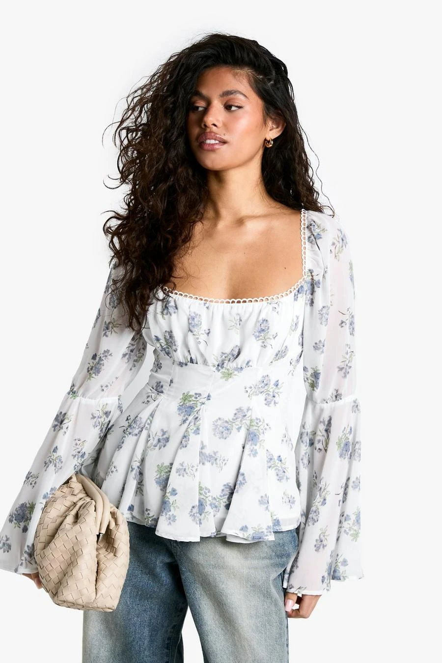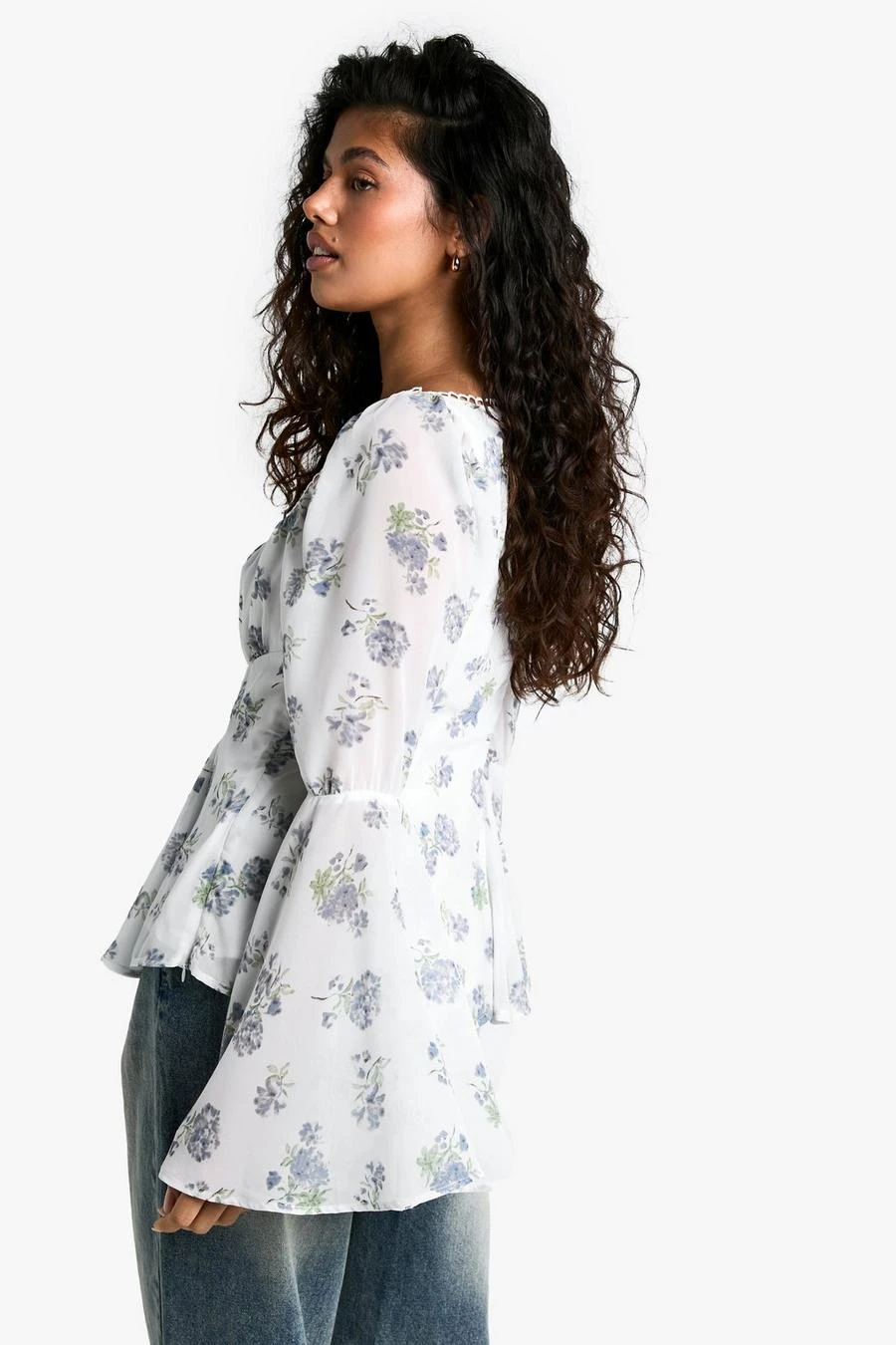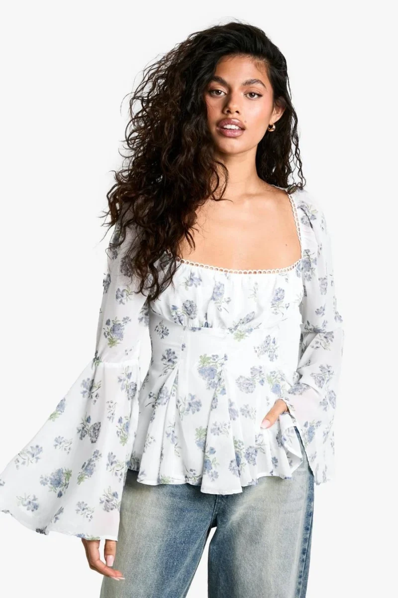 BOOHOO Ditsy Floral Print Corset Bust Flutter Sleeve Blouse