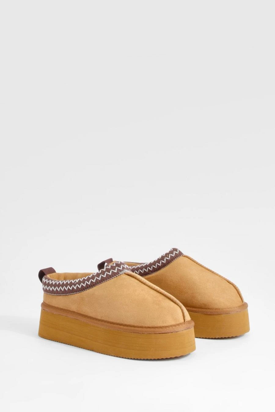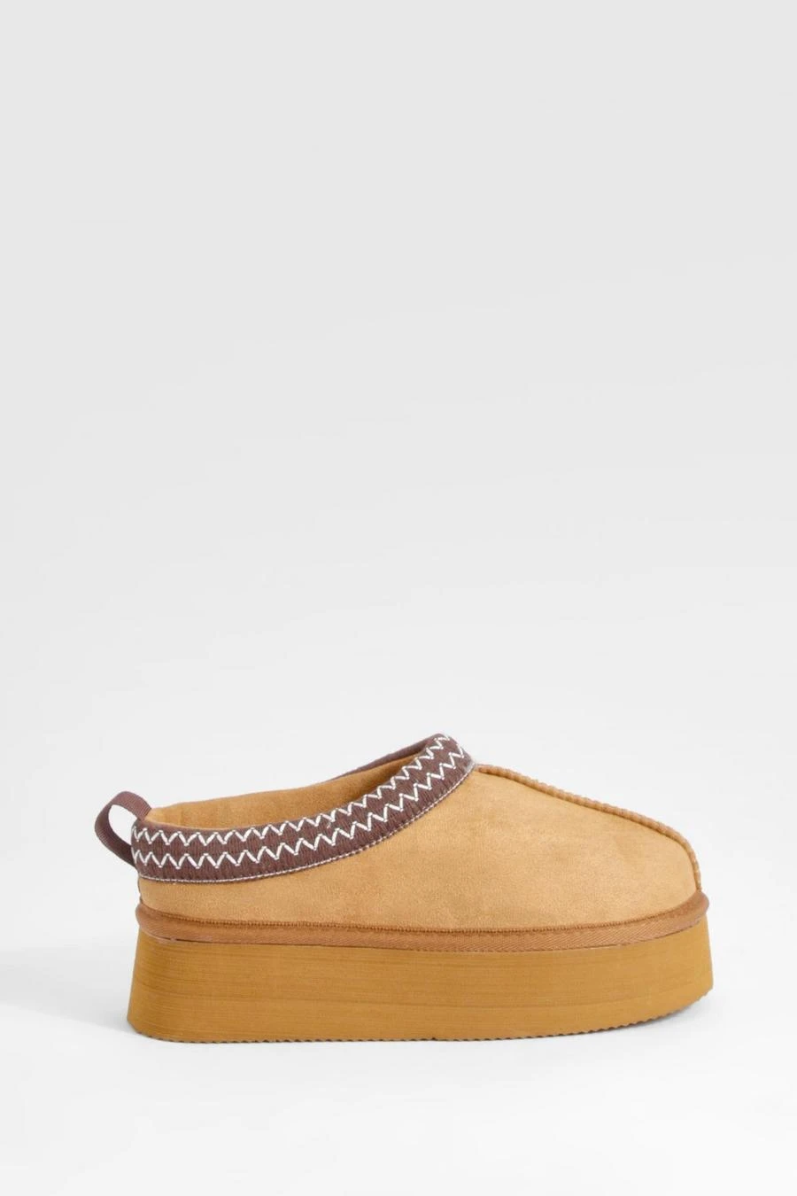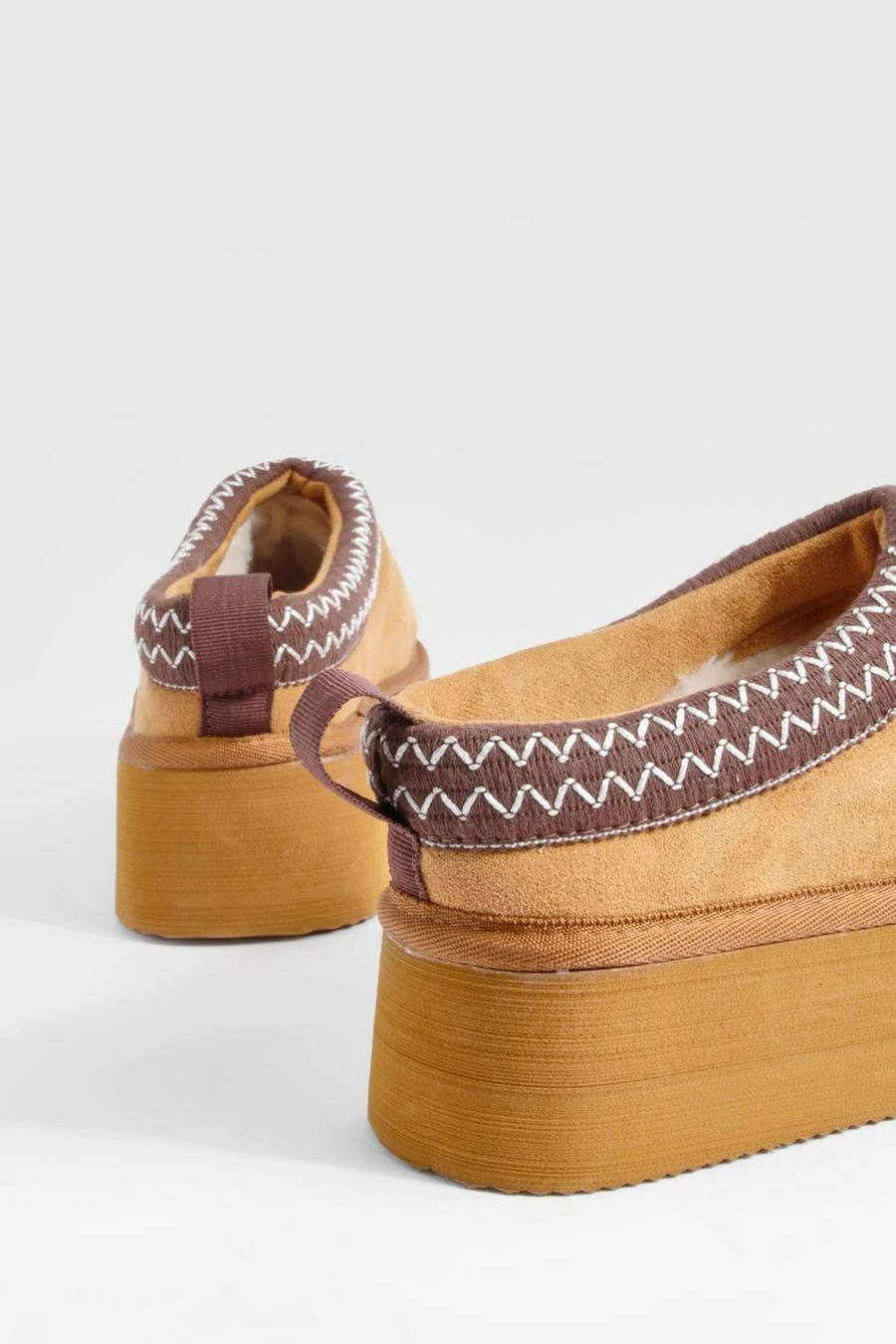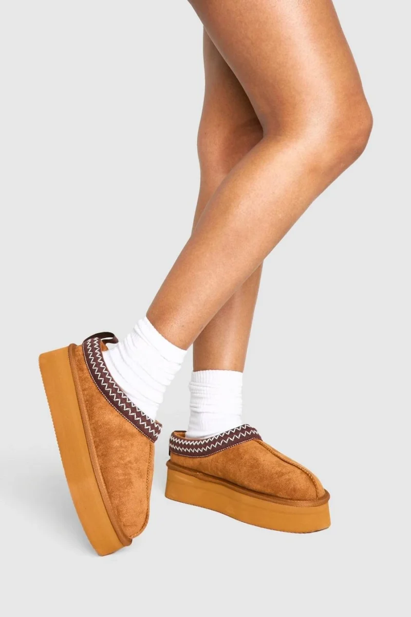 BOOHOO Embroidered Detailing Platform Slip On Faux Fur Lined Mules