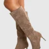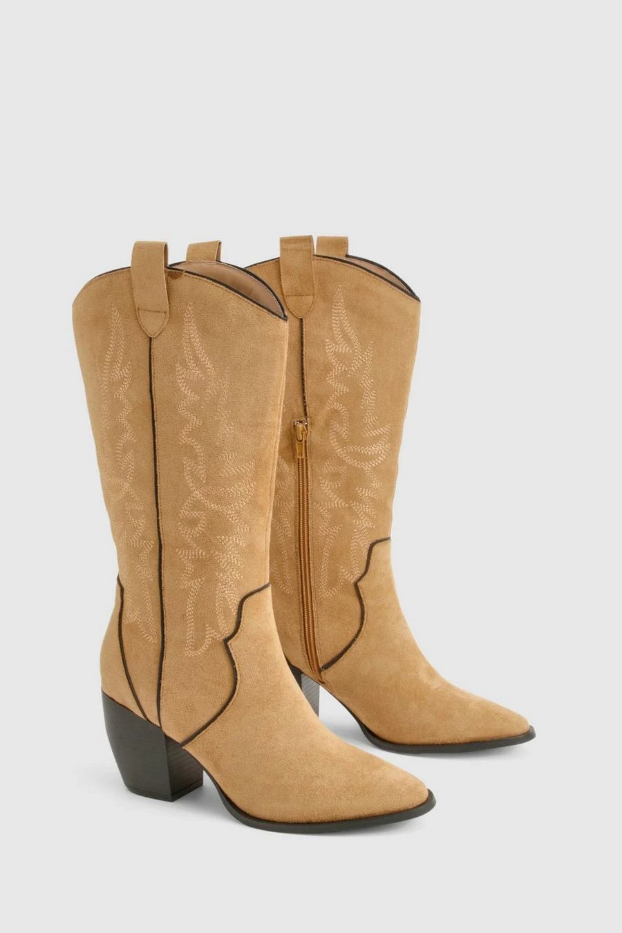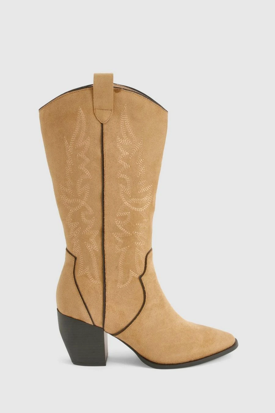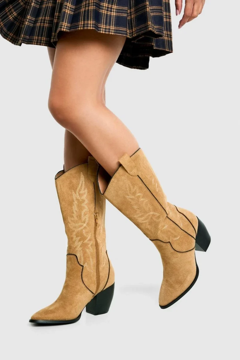 BOOHOO Faux Suede Embroidered Contrast Detail Western Boots