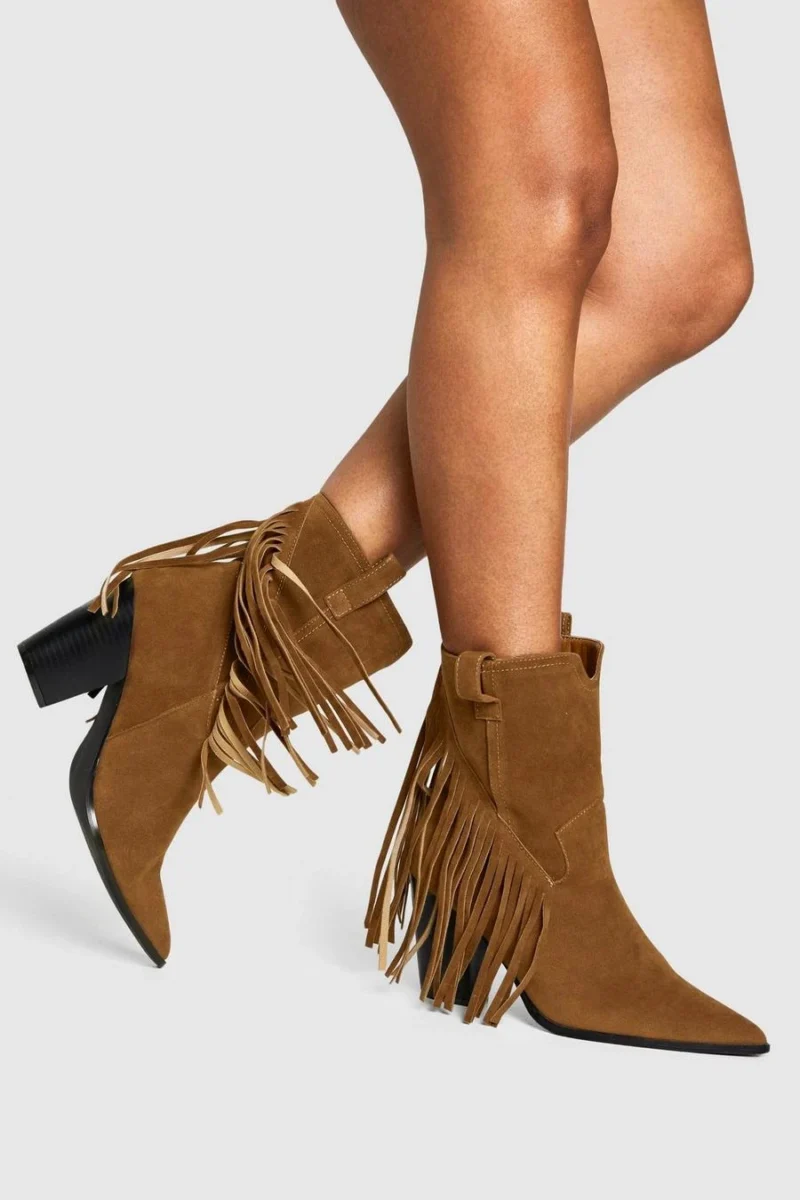 BOOHOO Faux Suede Fringe Tassel Detail Heeled Western Ankle Boot