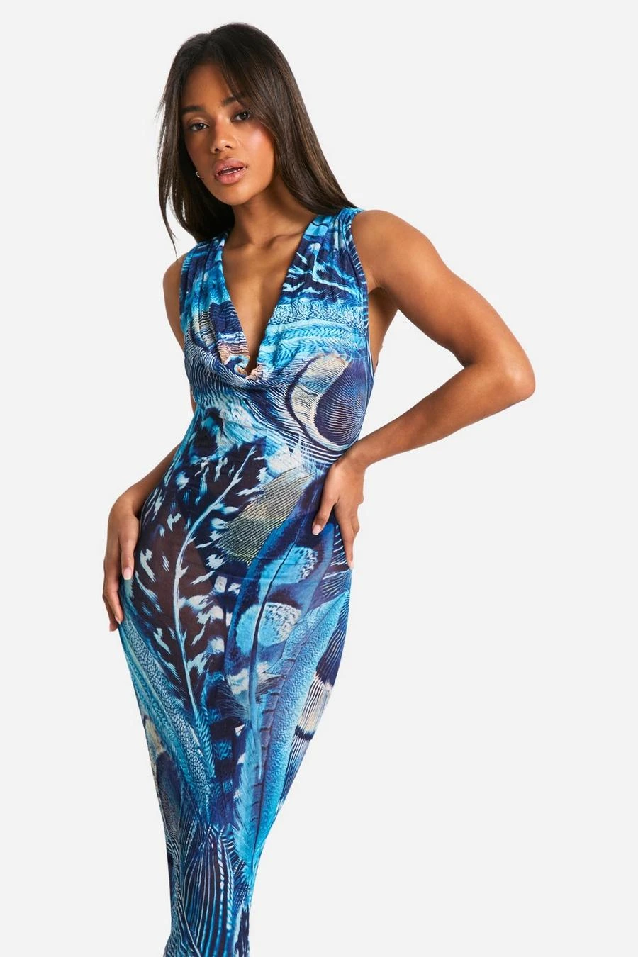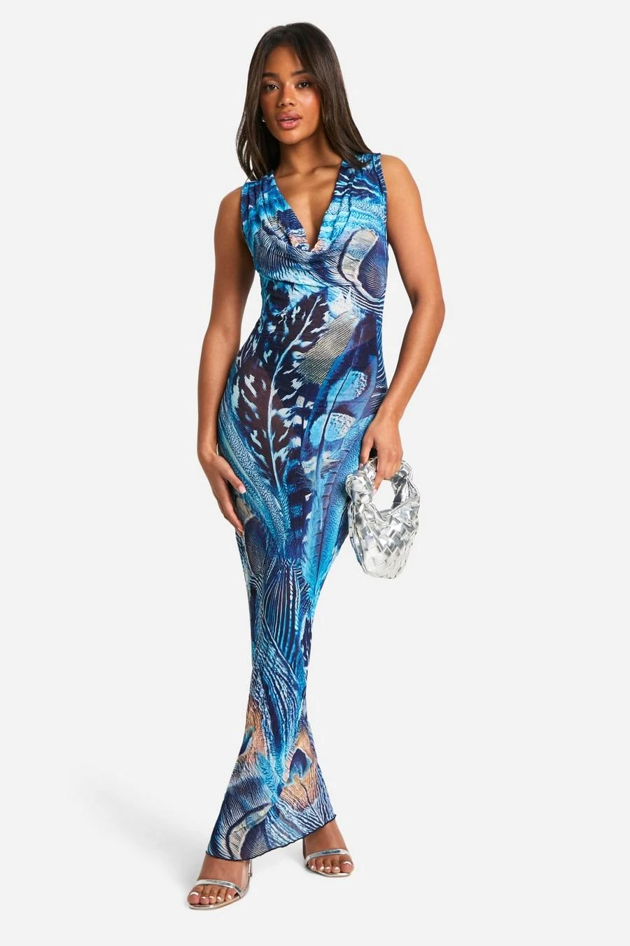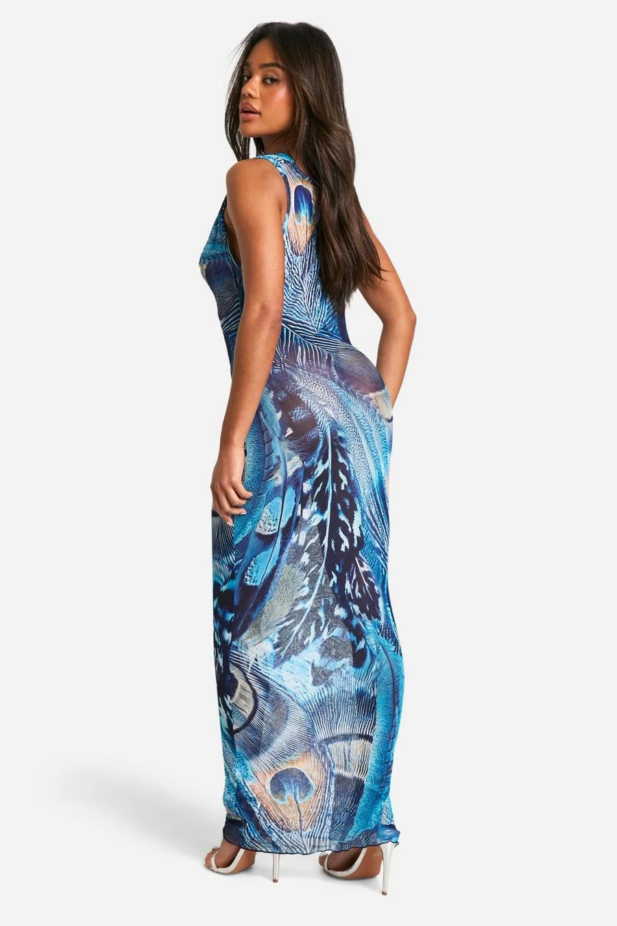 BOOHOO Feather Print Crinkle Mesh Maxi Dress