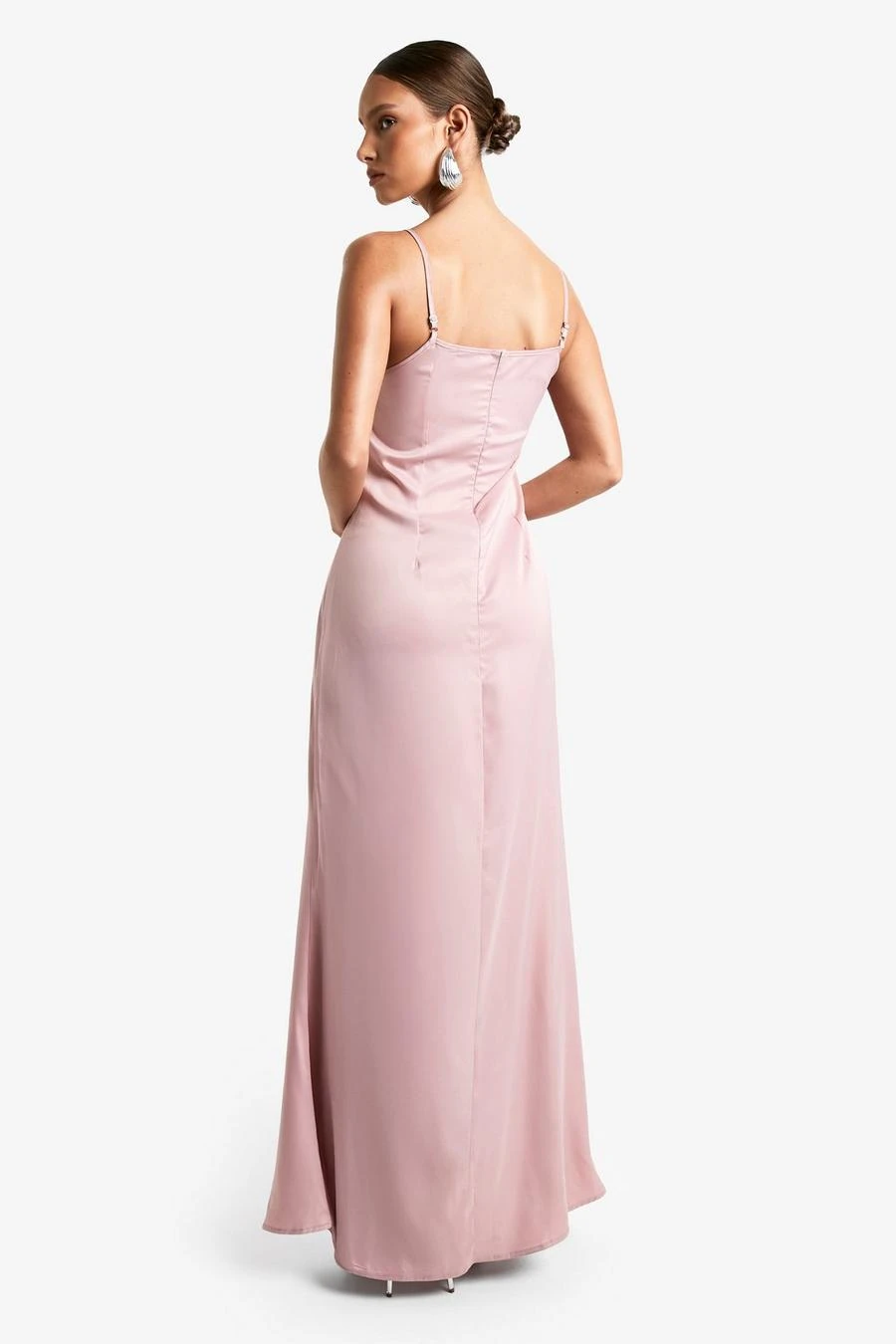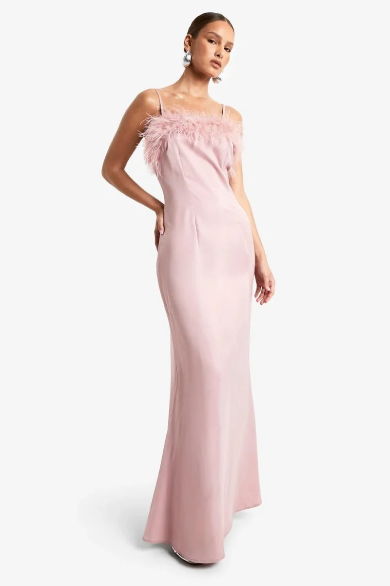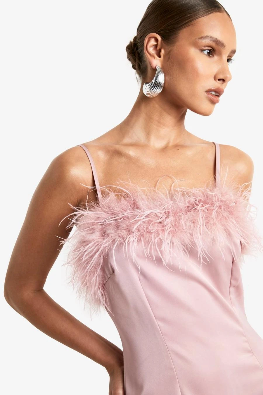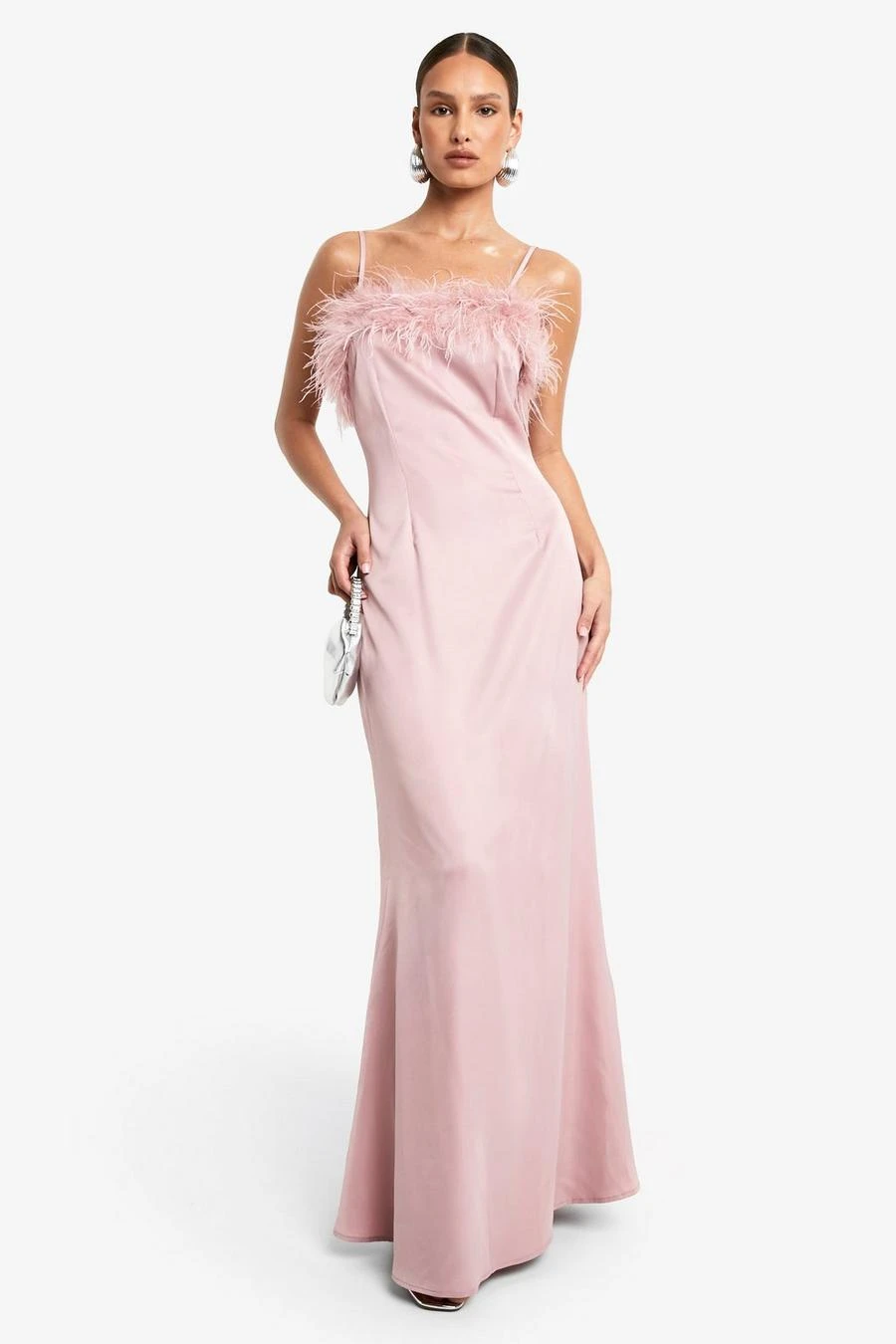 BOOHOO Feather Trim Satin Maxi Slip Dress