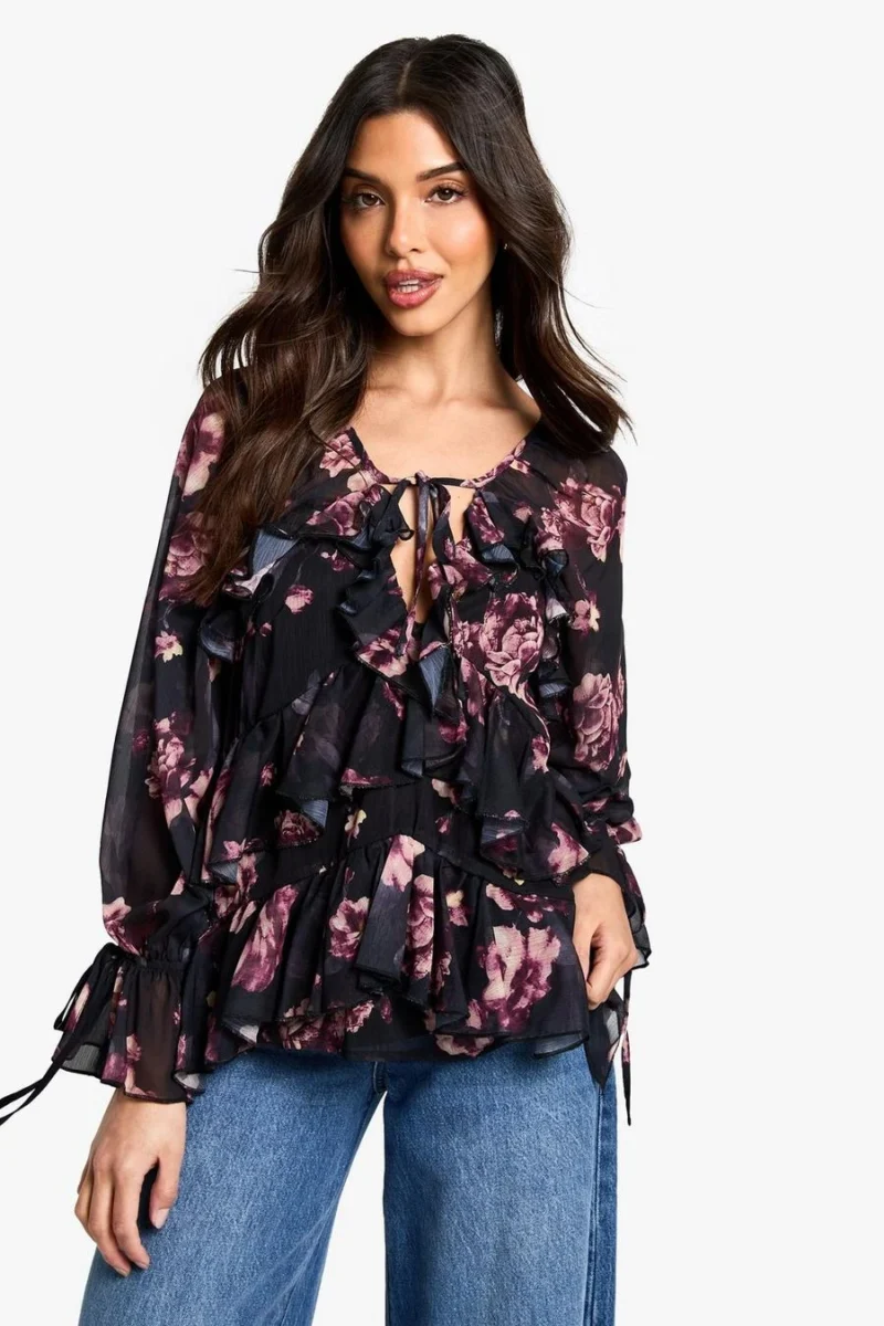 BOOHOO Floral Chiffon Extreme Ruffle Blouse