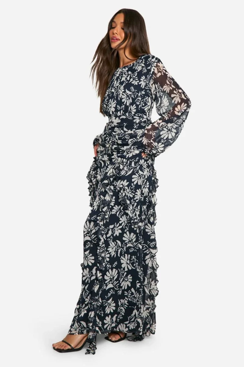 BOOHOO Floral Crinkle Chiffon Ruffle Maxi Dress