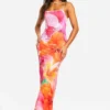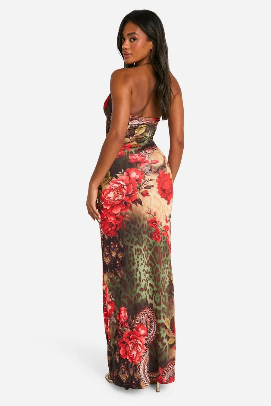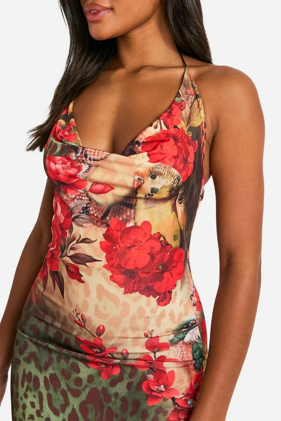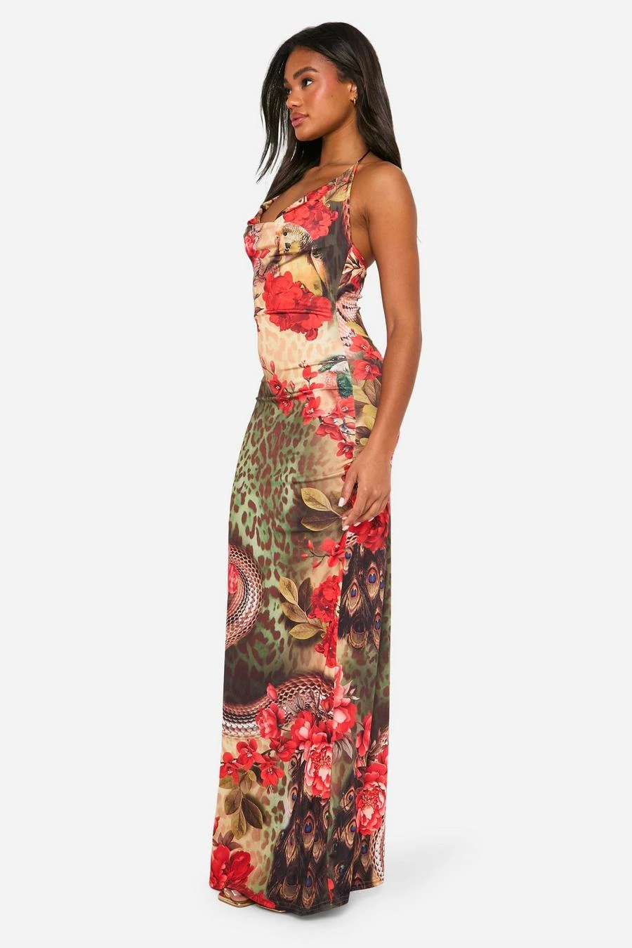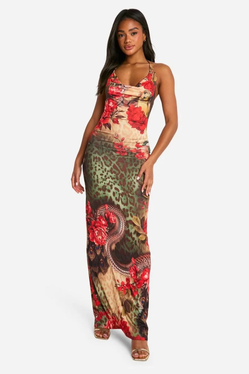 BOOHOO Floral Leopard Cowl Neck Slinky Maxi Dress