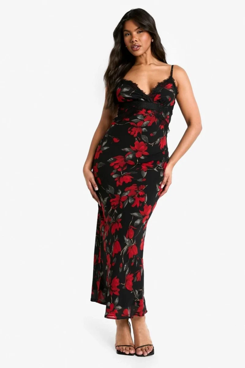 BOOHOO Floral Print Lace Trim Maxi Dress