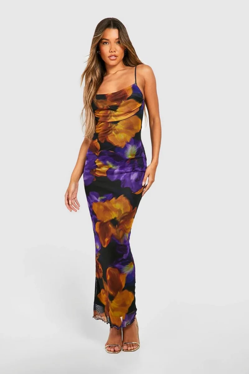 BOOHOO Floral Print Mesh Maxi Slip Dress
