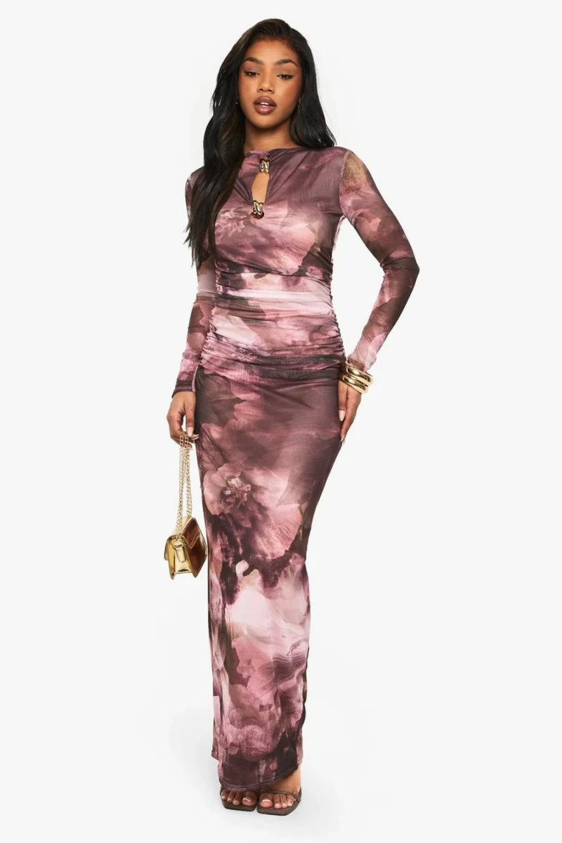 BOOHOO Floral Printed Mesh Keyhole Long Sleeve Maxi Dress