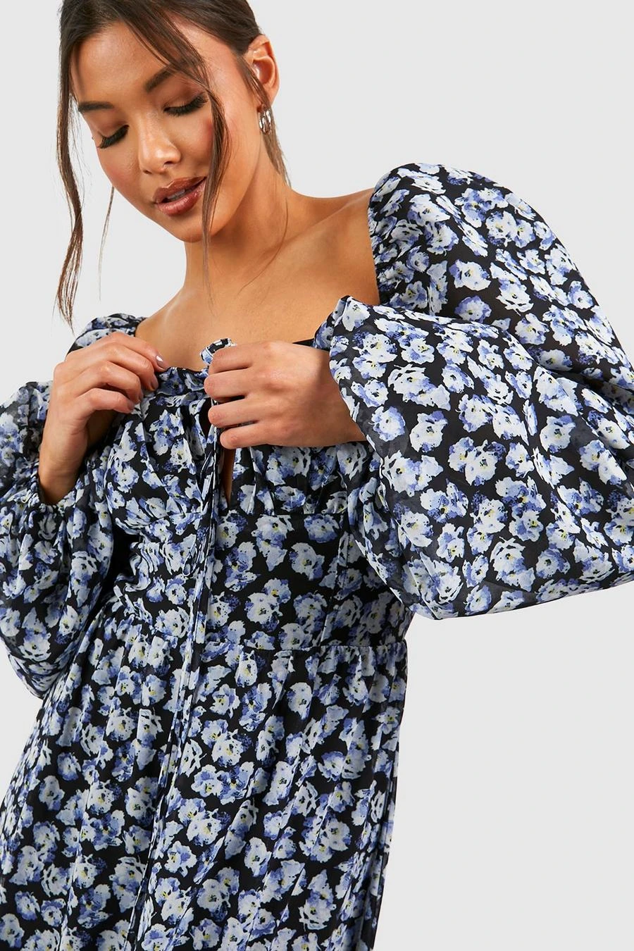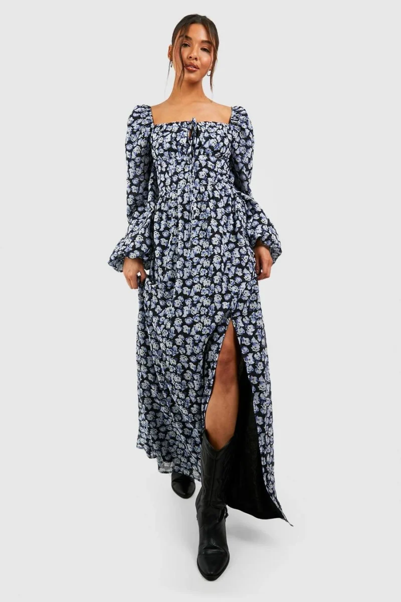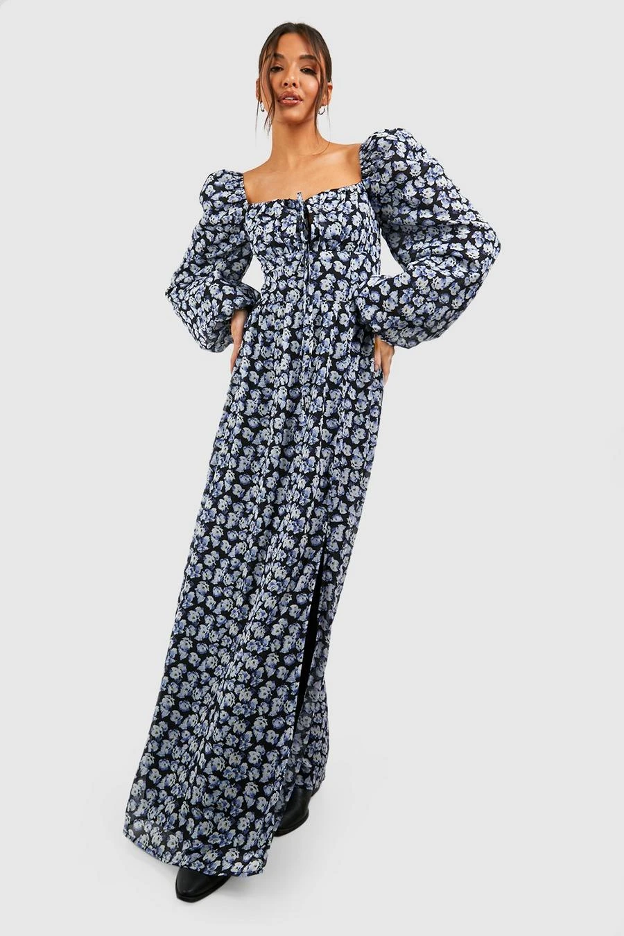 BOOHOO Floral Puff Sleeve Rouched Bust Maxi Milkmaid Dress