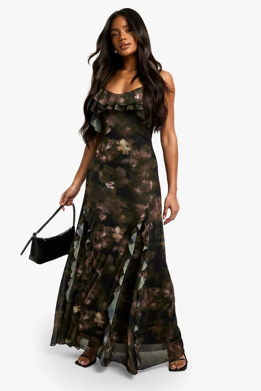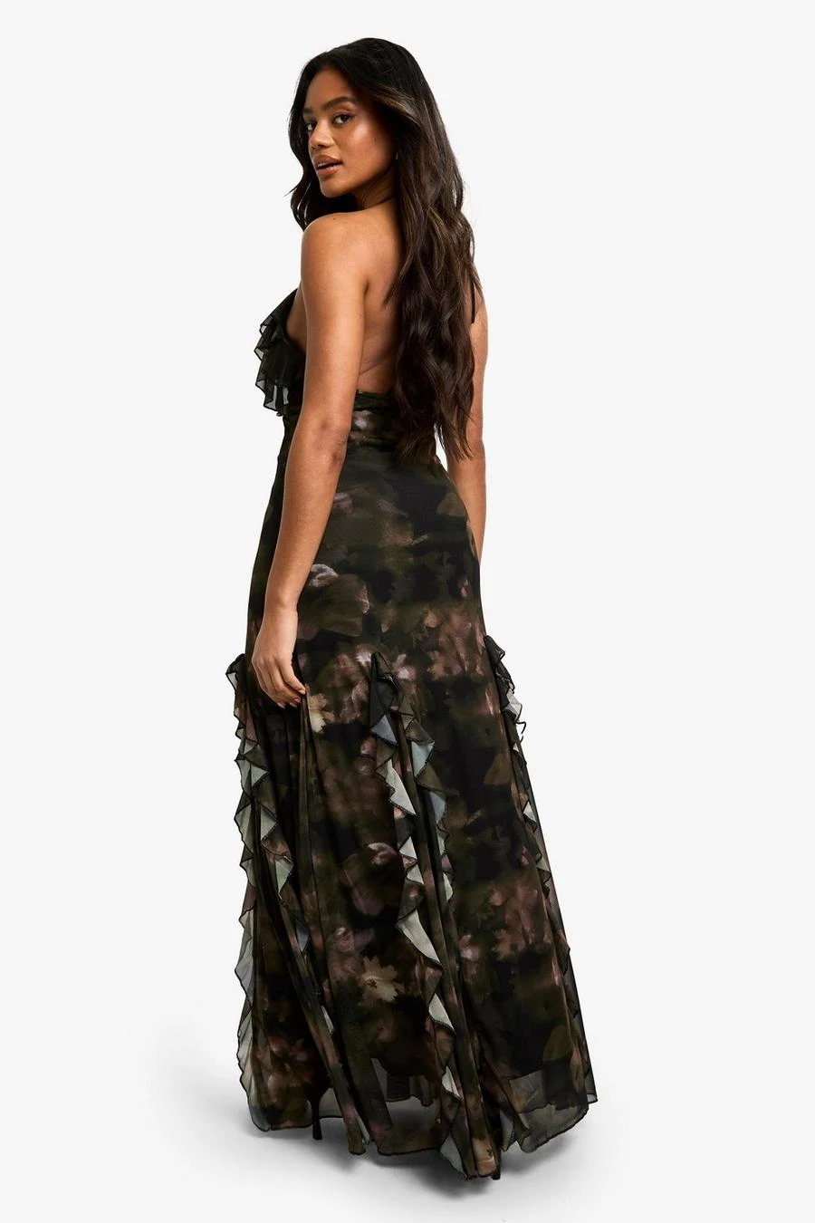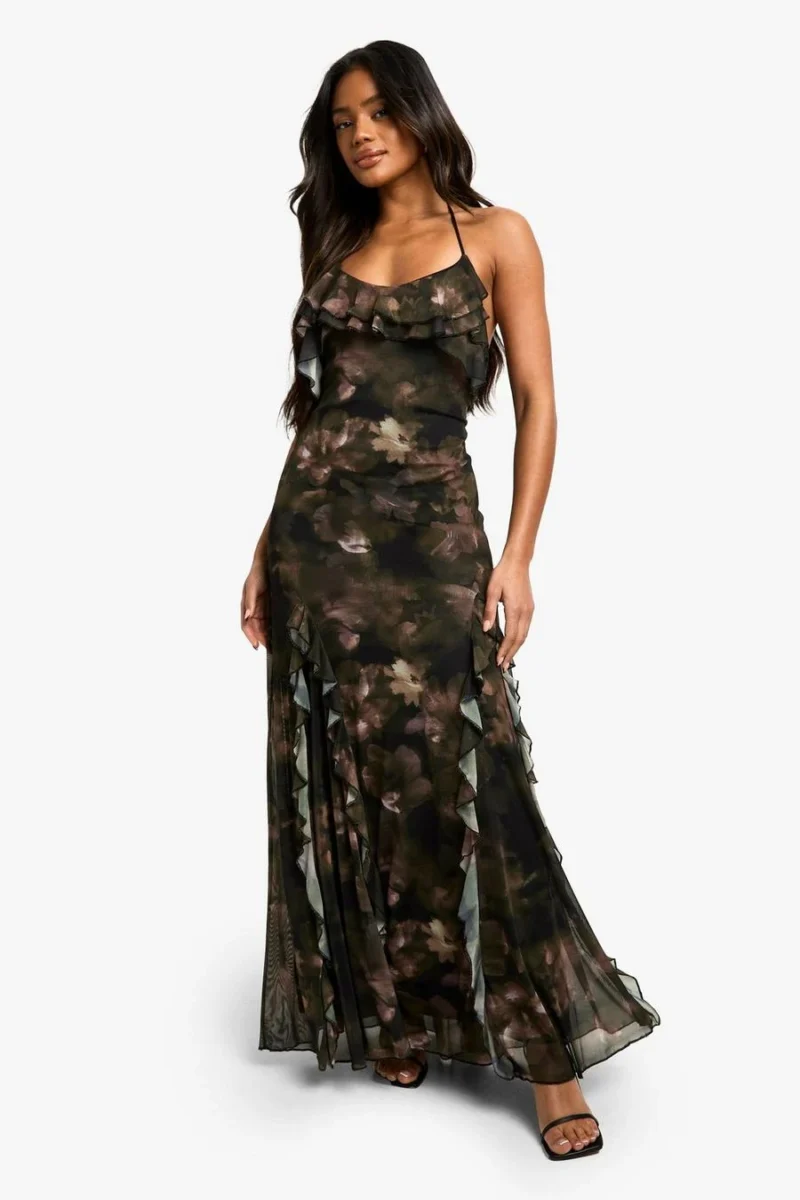 BOOHOO Floral Ruffle Printed Mesh Maxi Dress