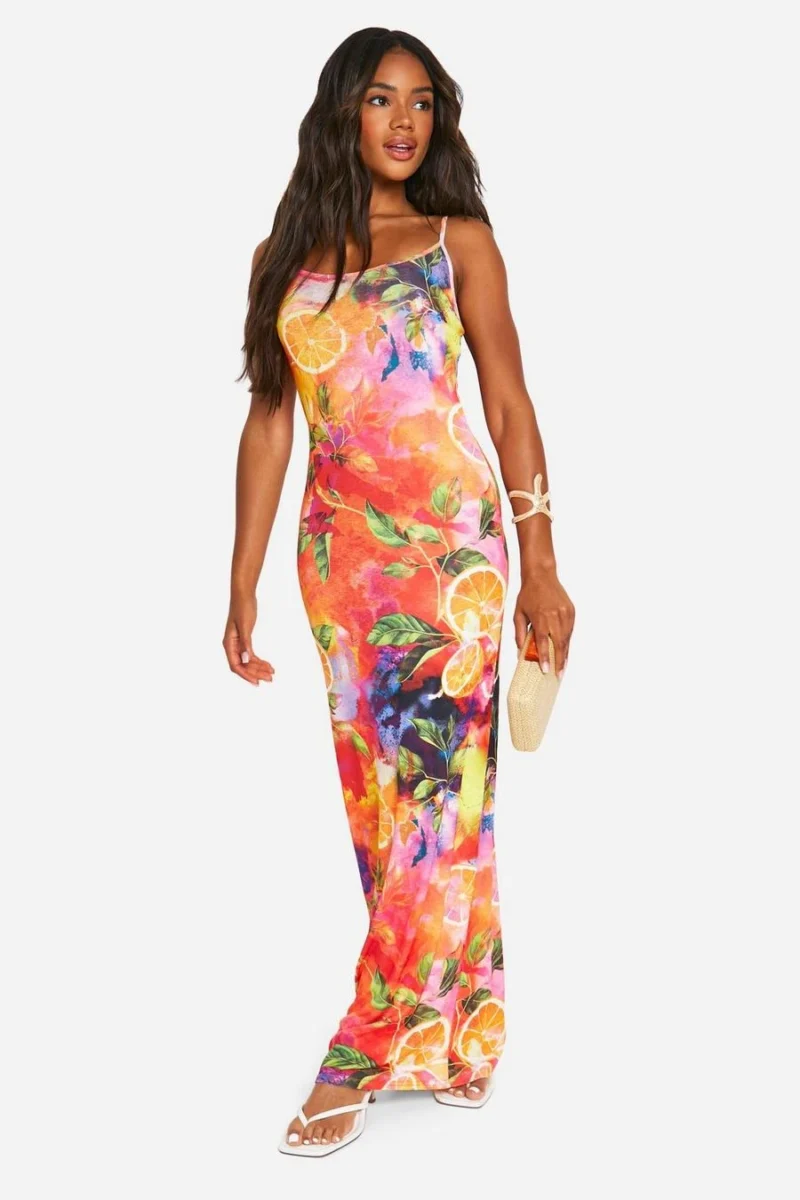 BOOHOO Fruit Print Textured Sheer Maxi Dress