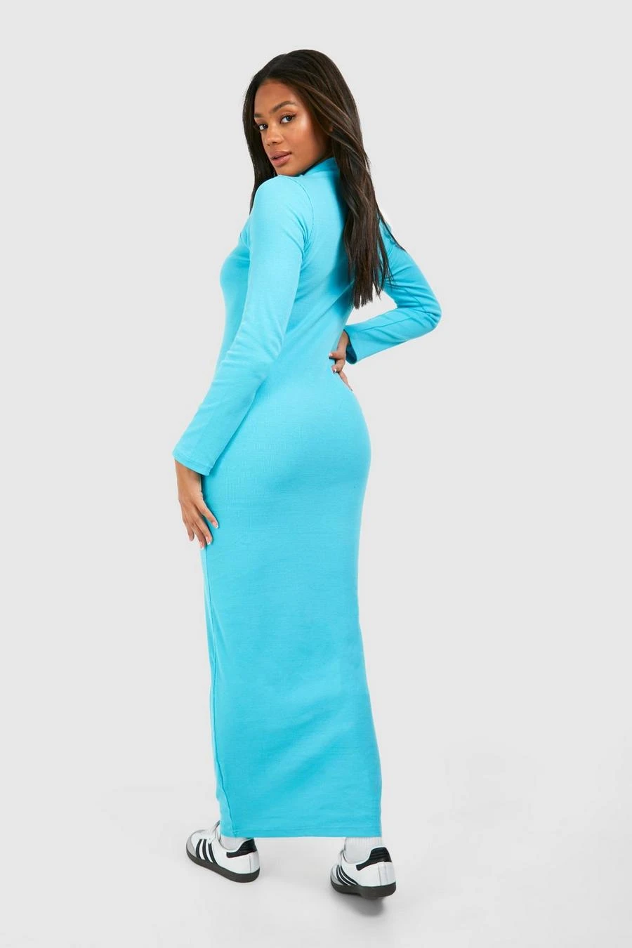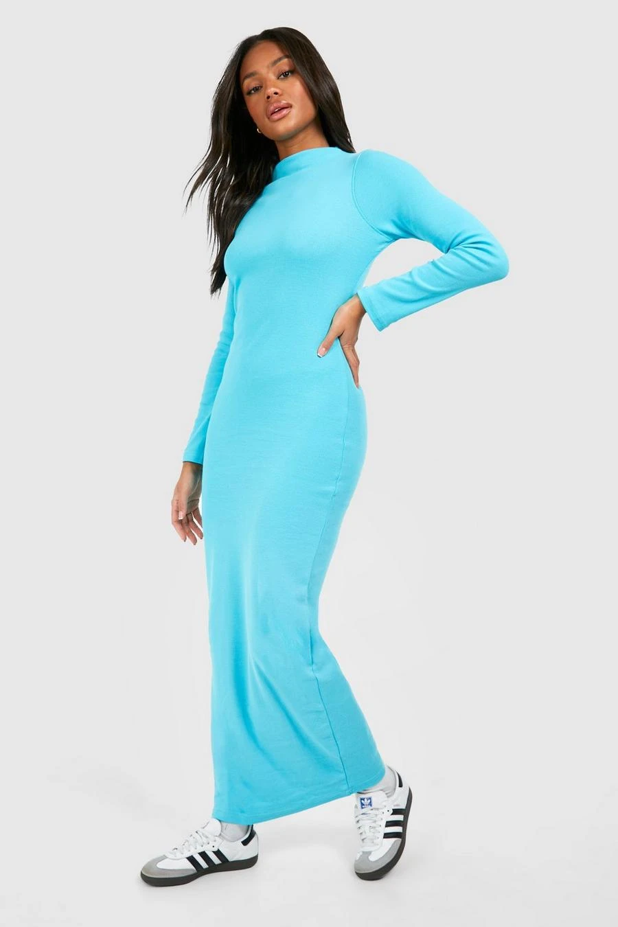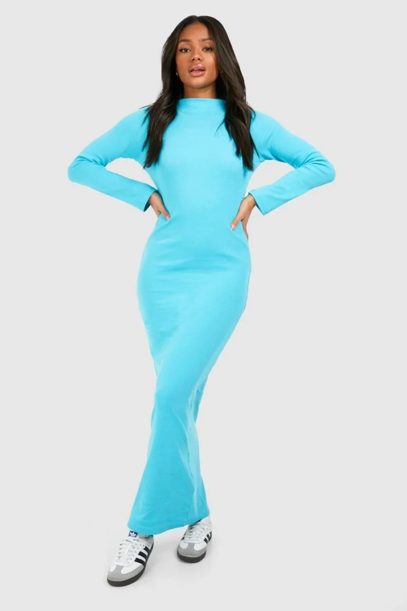BOOHOO Funnel Neck Long Sleeve Rib Maxi Dress