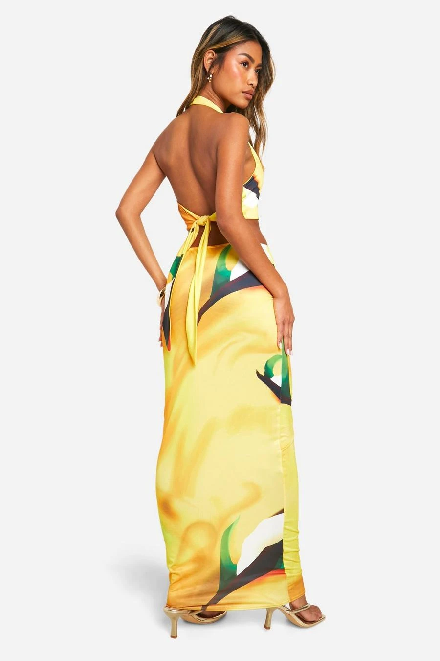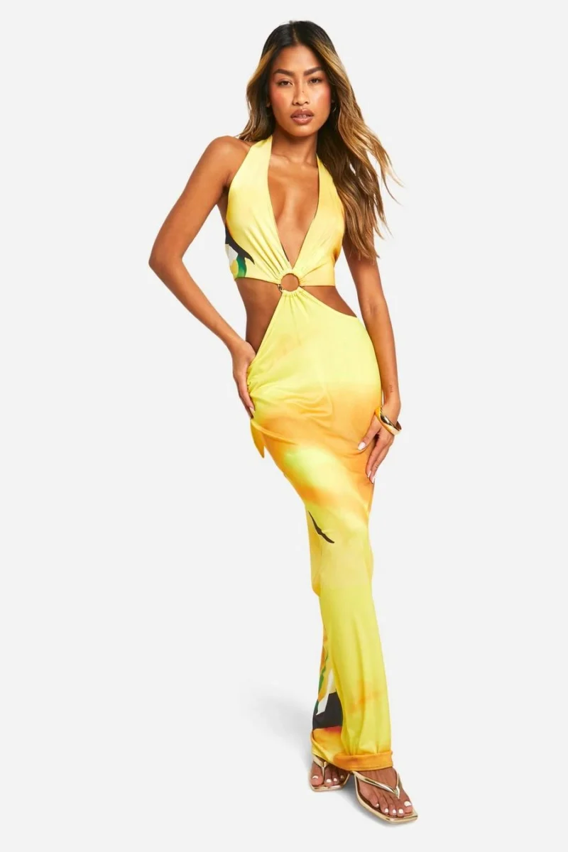 BOOHOO Gold Trim Printed Plunge Cut Out Slinky Maxi Dress