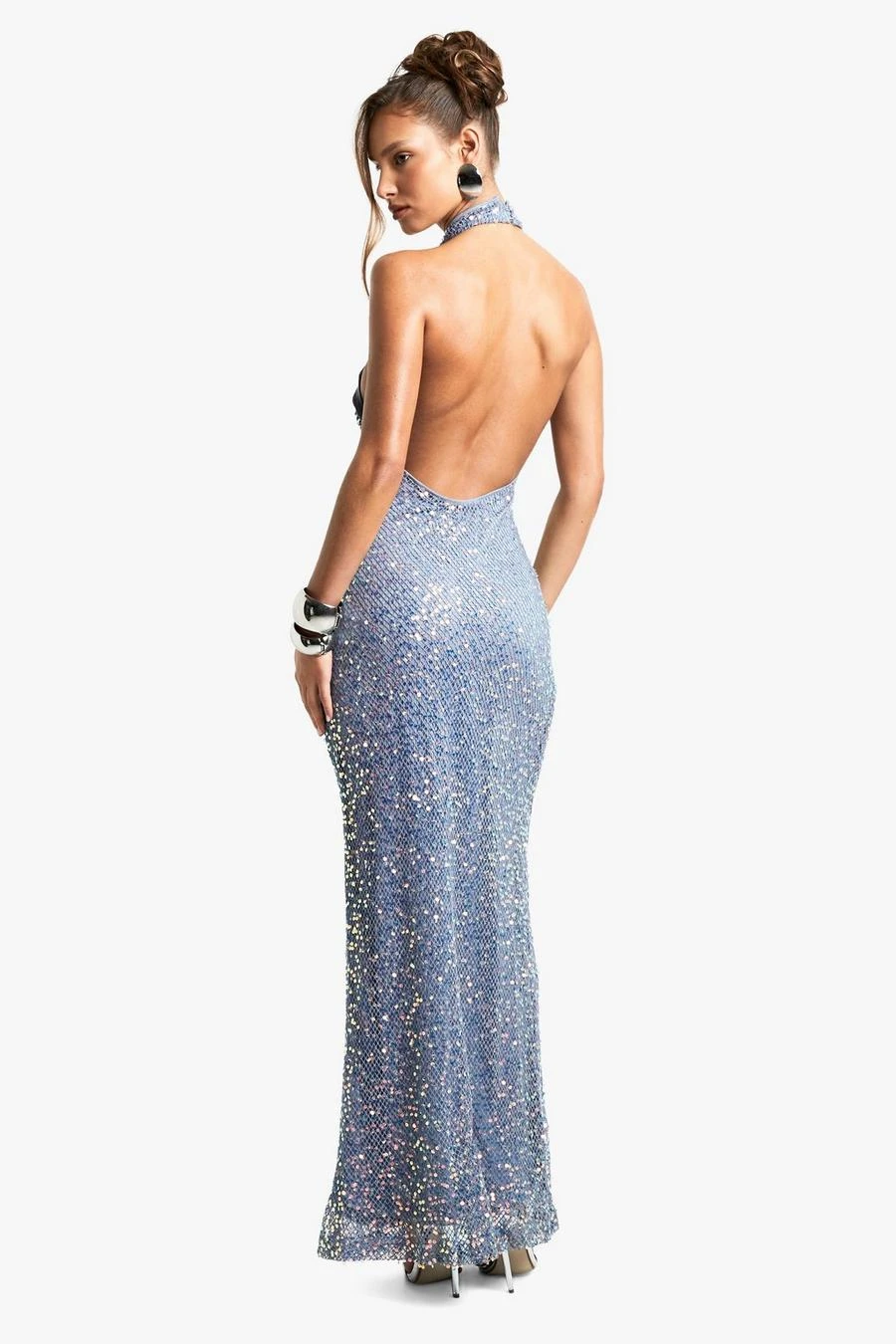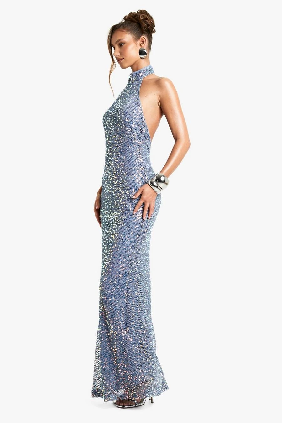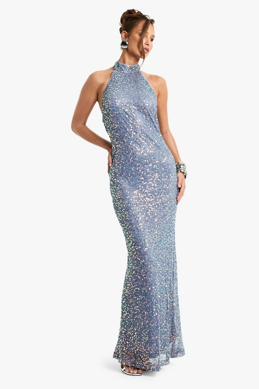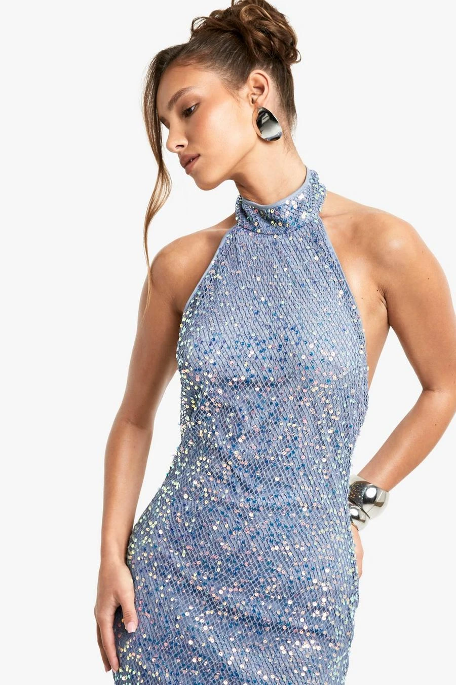 BOOHOO High Neck Racer Crochet Sequin Maxi Dress