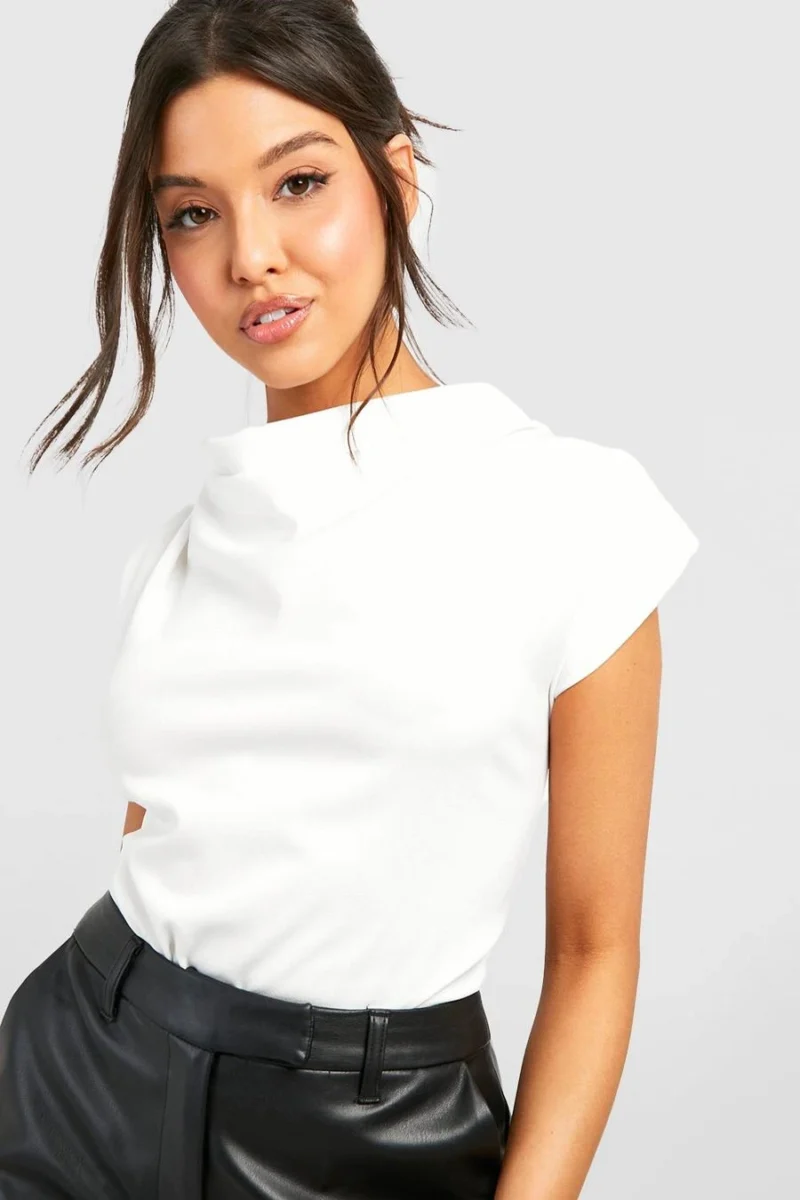 BOOHOO Ivory Cowl Neck Crepe Shoulder Pad Blouse