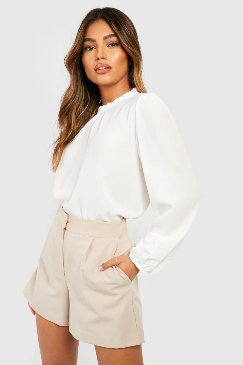 BOOHOO Ivory Frill Neck Long Sleeve Woven Blouse