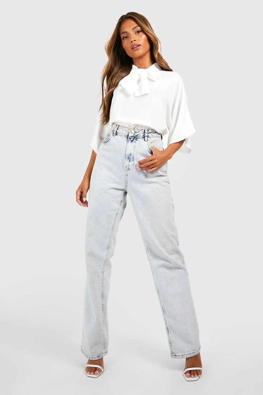 BOOHOO Ivory Woven Tie Neck Floaty Flared Sleeve Blouse