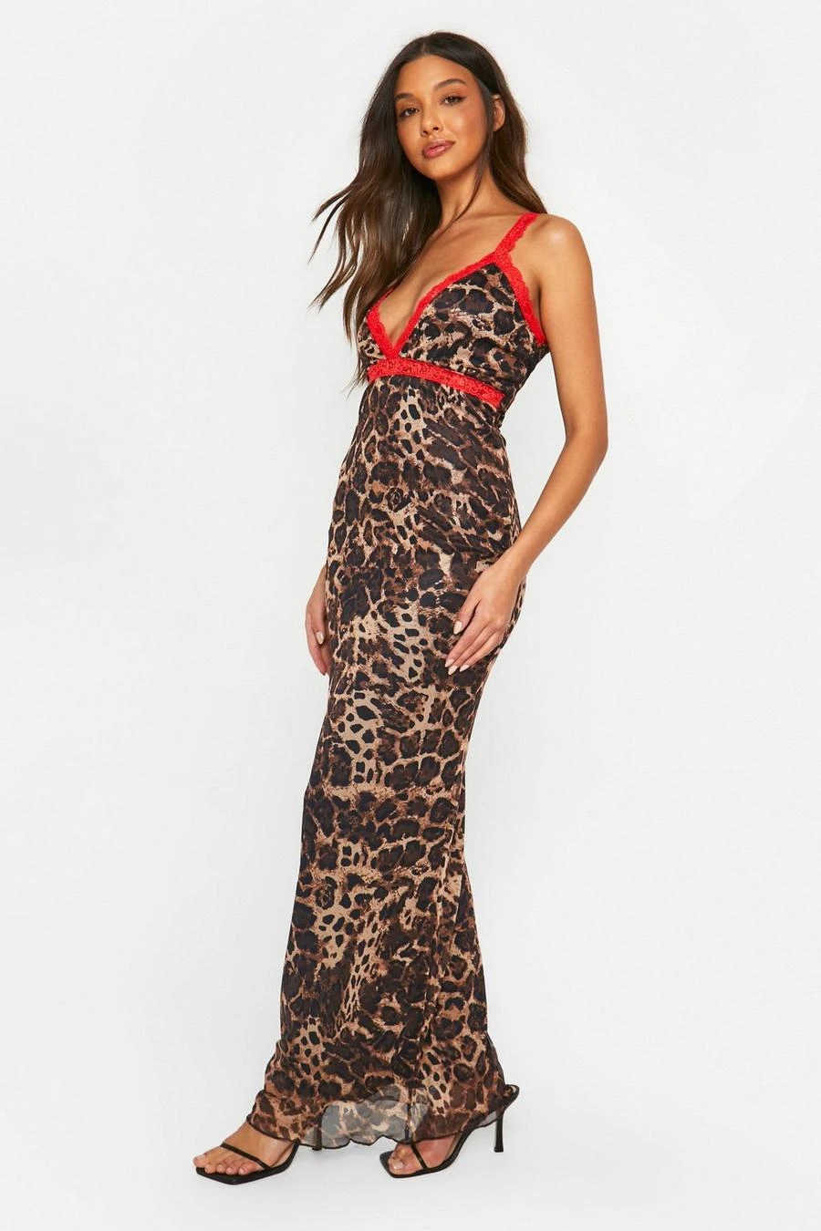 BOOHOO Lace Trim Leopard Mesh Maxi Dress
