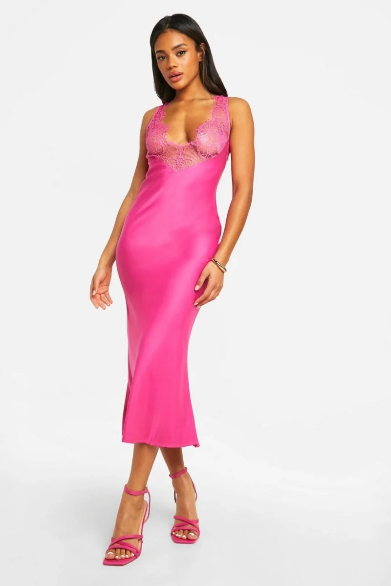 BOOHOO Lace Trim Satin Midi Slip Dress