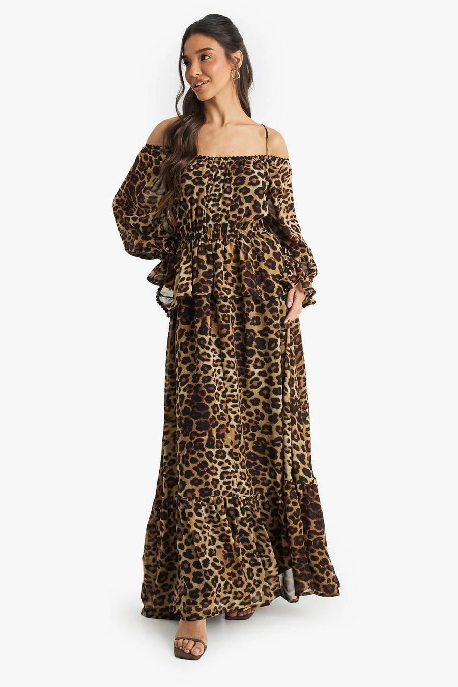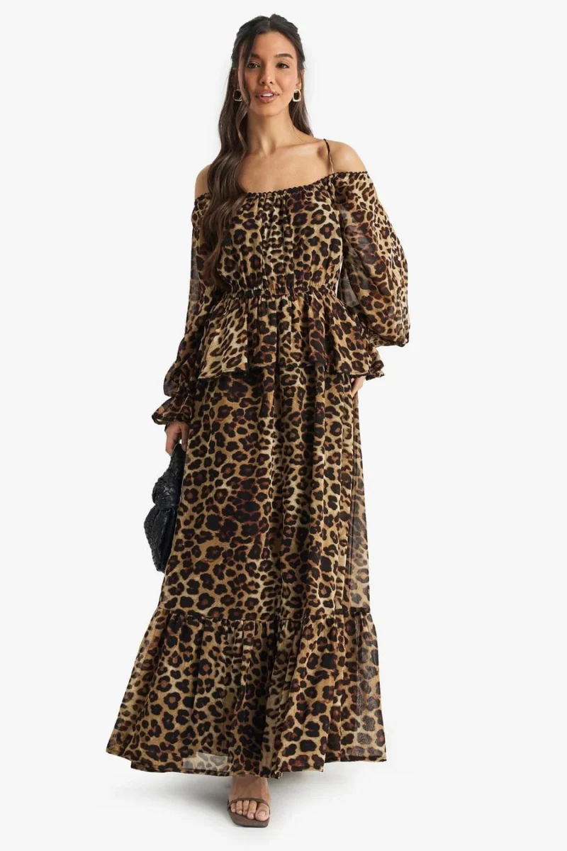 BOOHOO Leopard Chiffon Cold Shoulder Ruffle Maxi Dress