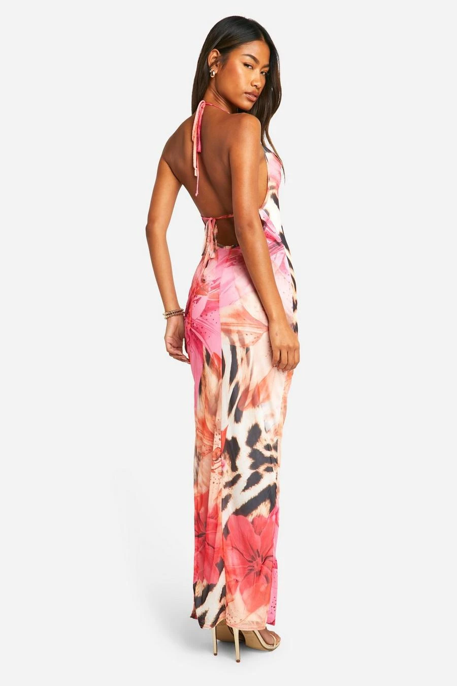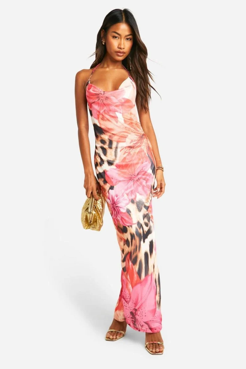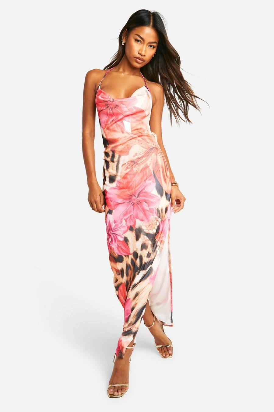 BOOHOO Leopard Floral Cowl Neck Mesh Maxi Dress