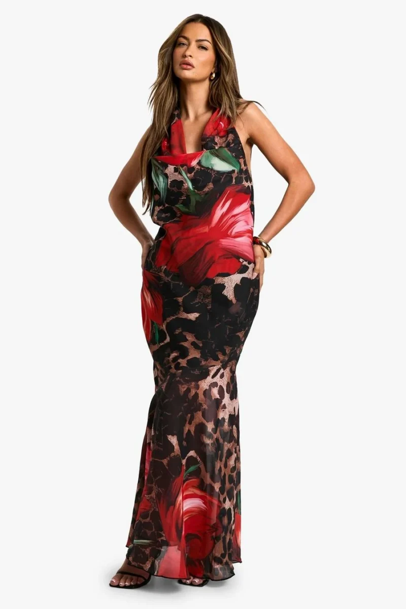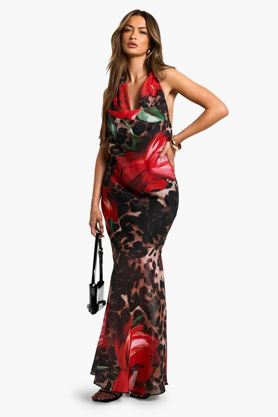 BOOHOO Leopard Floral Mix Chiffon Halterneck Maxi Dress
