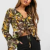 BOOHOO Leopard Mesh Split Sleeve Crop Blouse