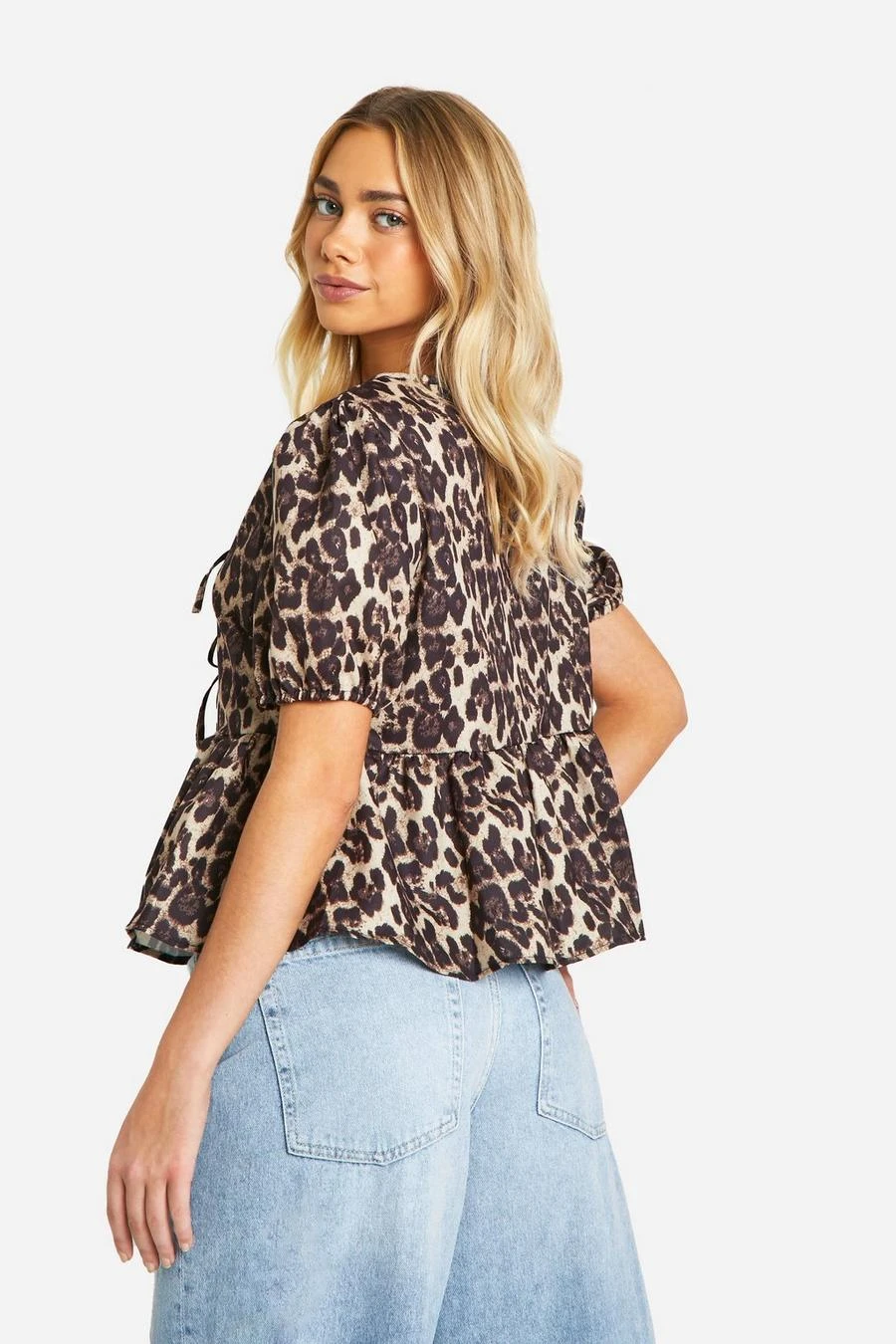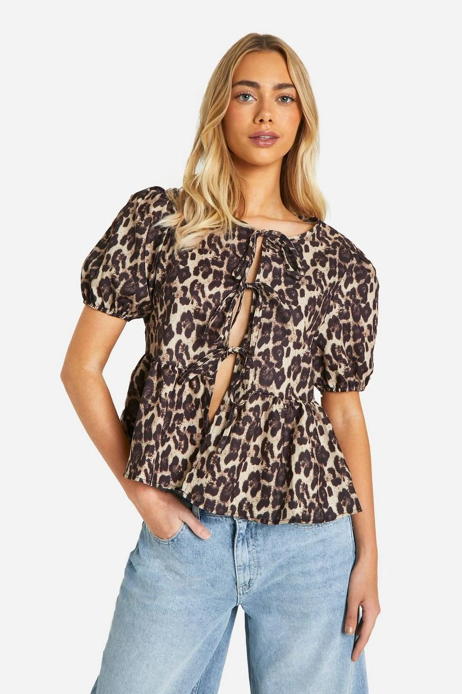 BOOHOO Leopard Puff Sleeve Bow Tie Blouse