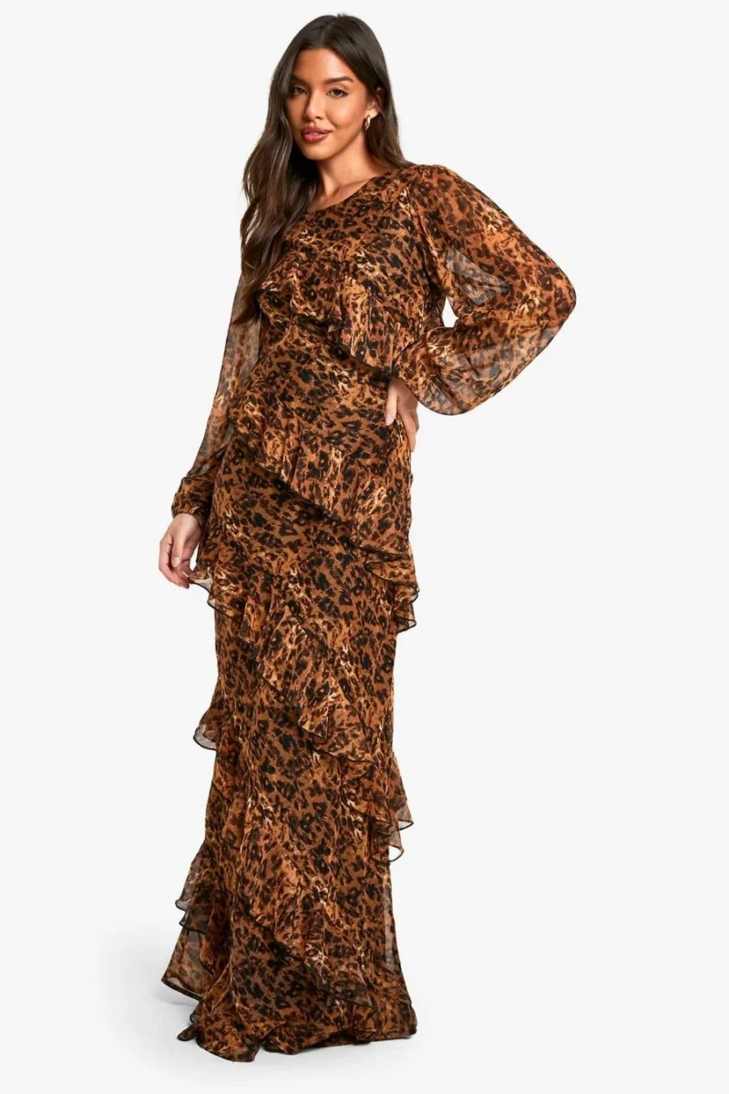 BOOHOO Leopard Ruffle Chiffon Maxi Dress