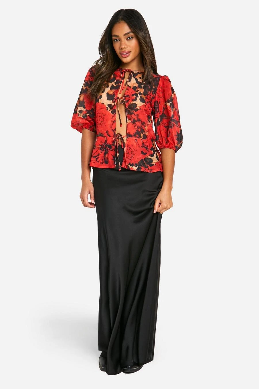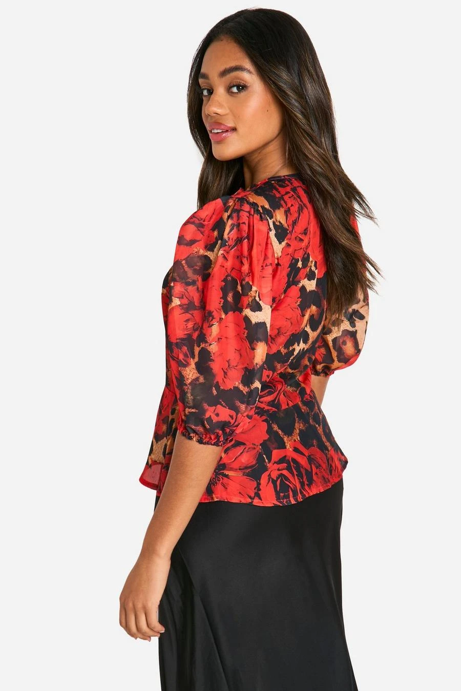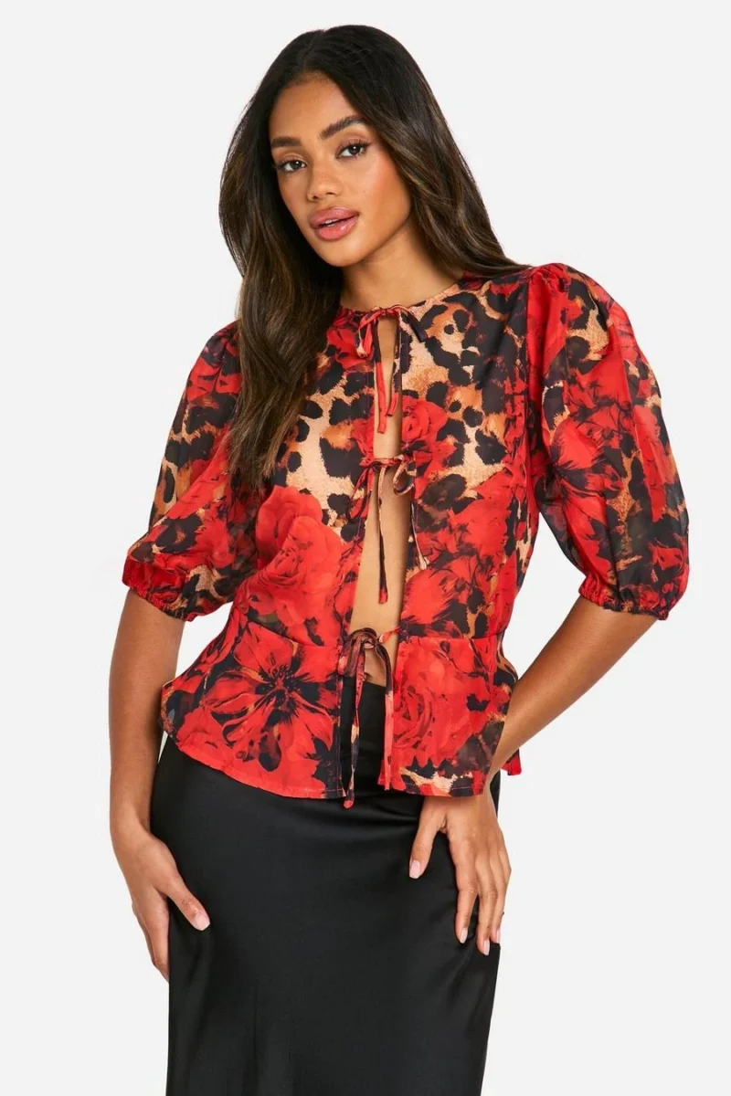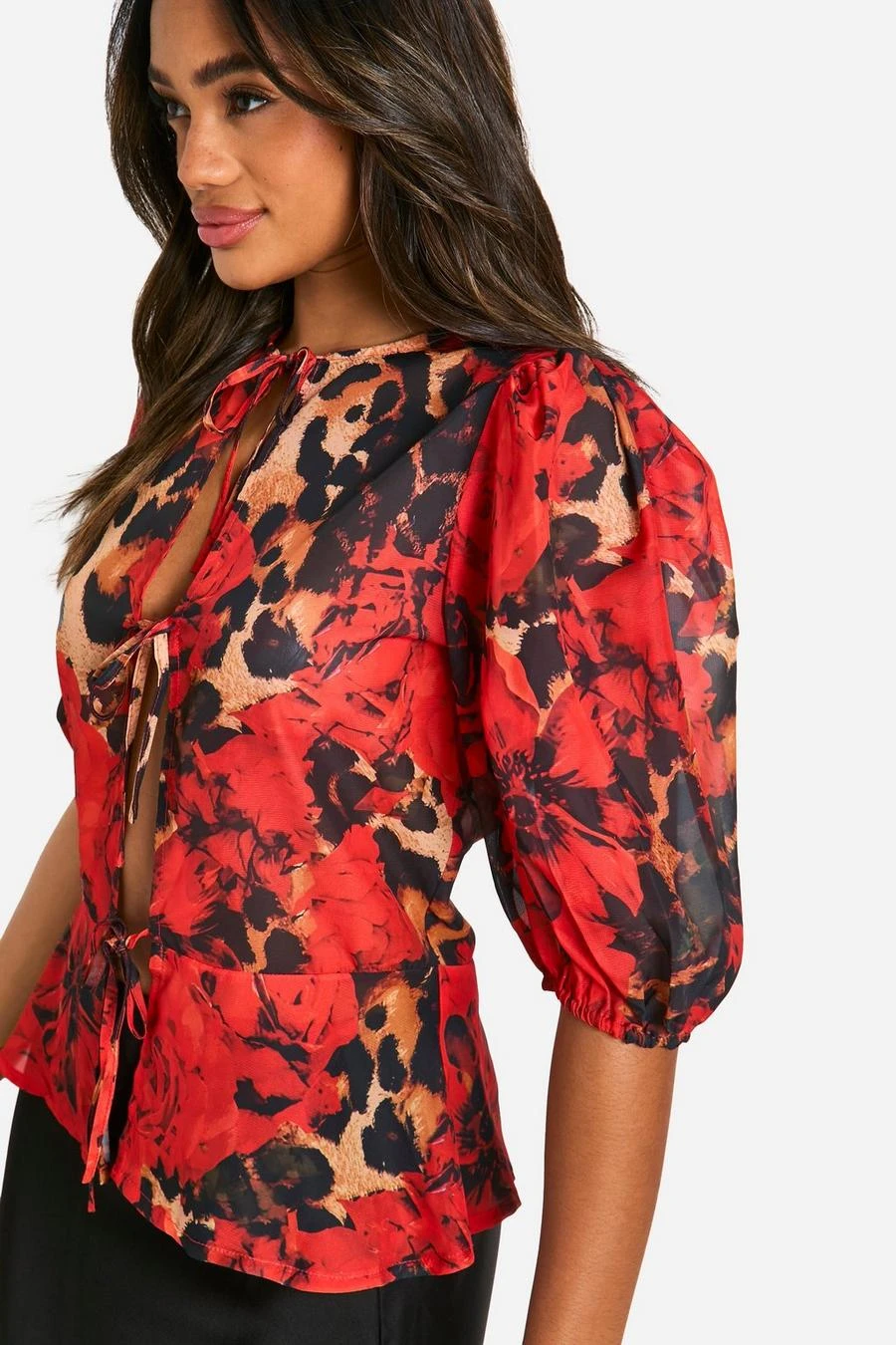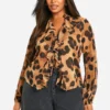 BOOHOO Leopard Volume Sleeve Tie Front Blouse
