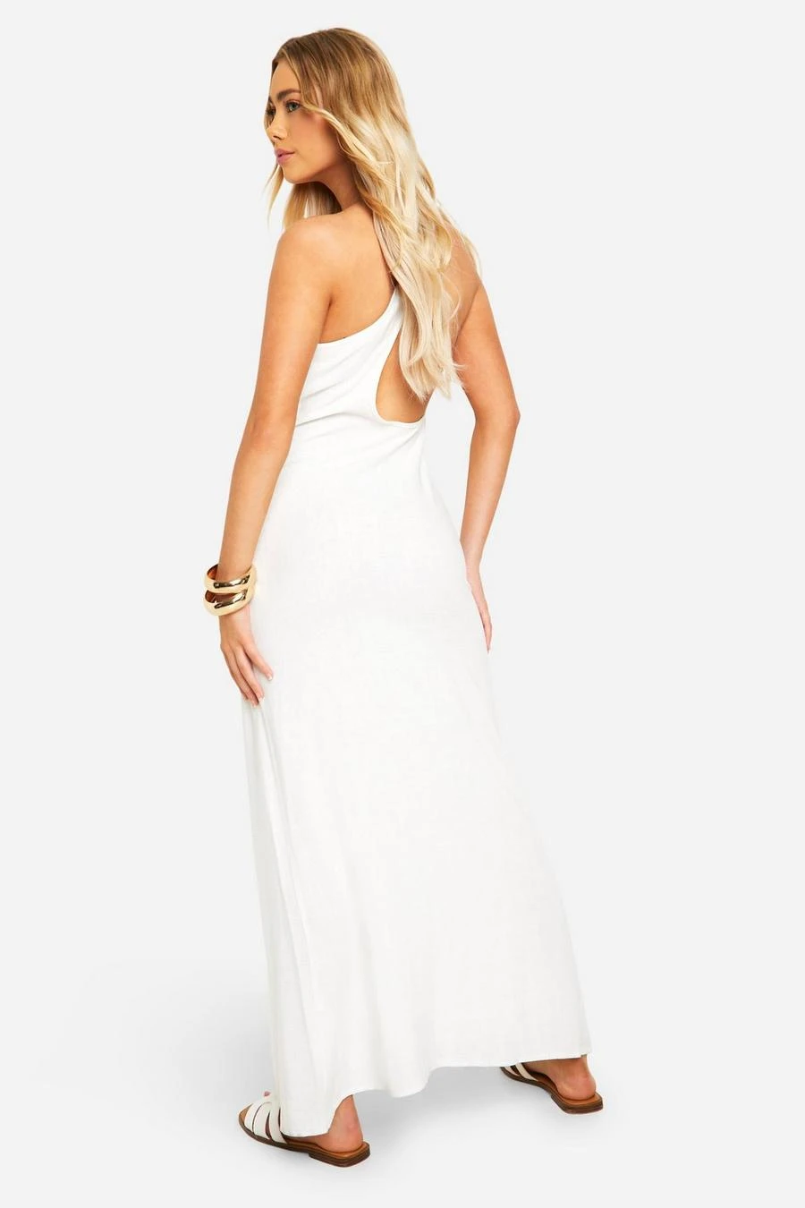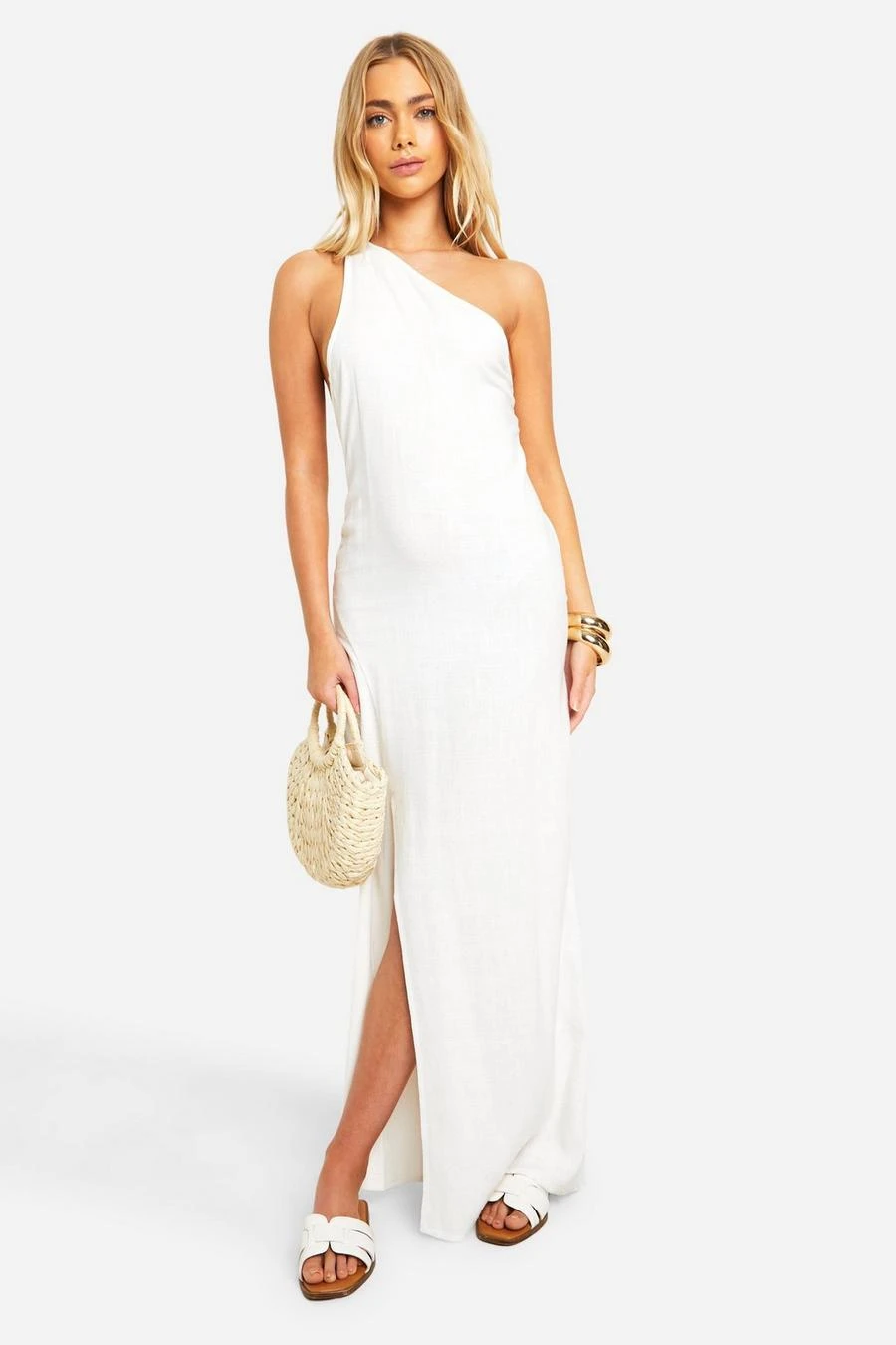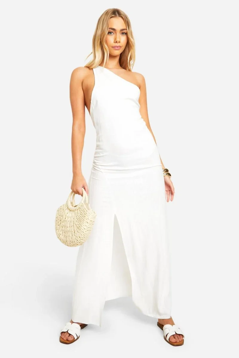 BOOHOO Linen Look One Shoulder Maxi Dress