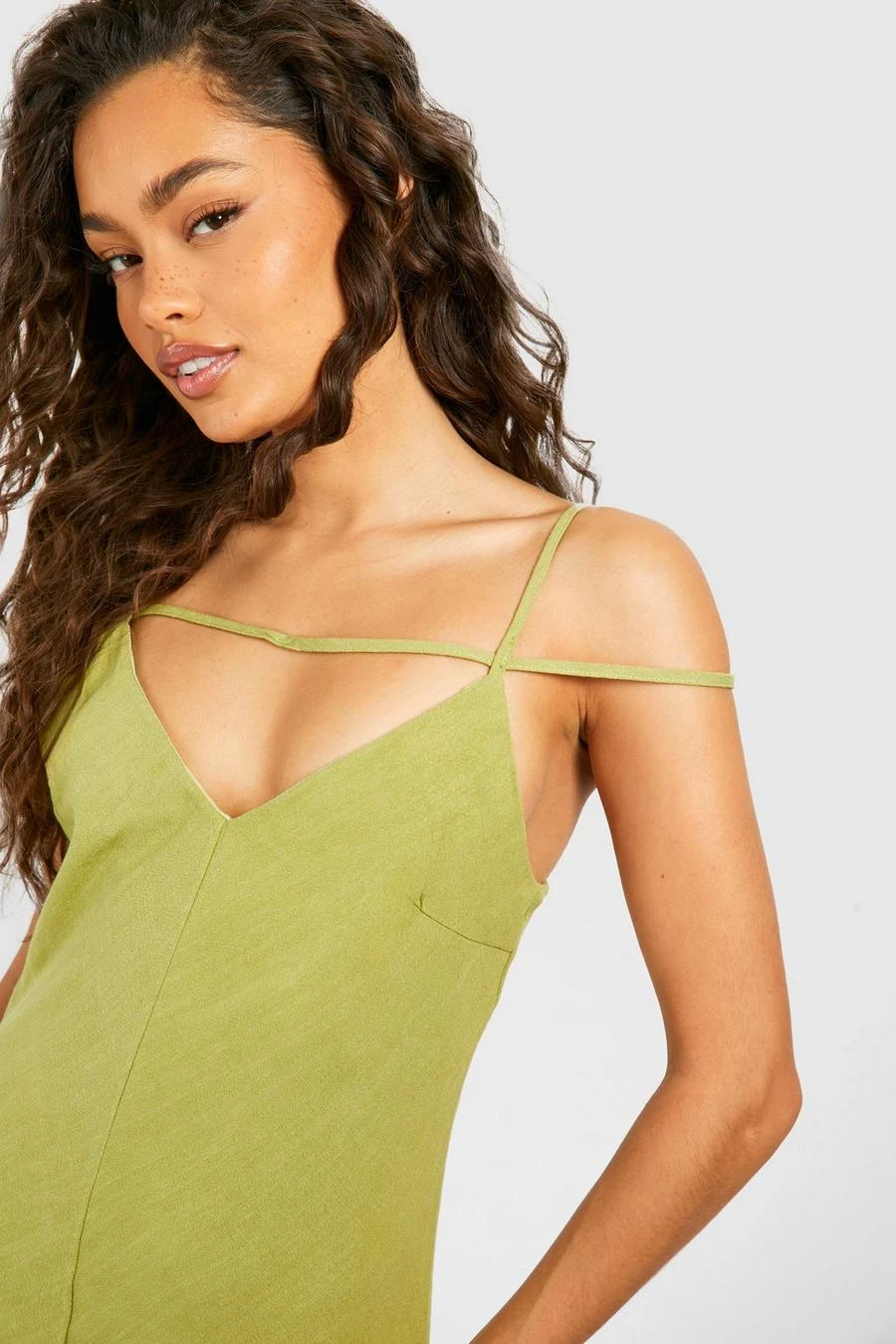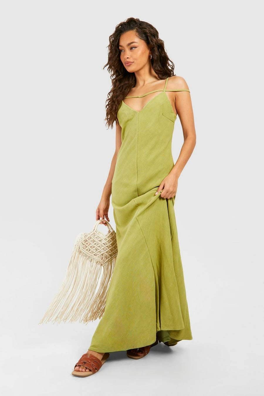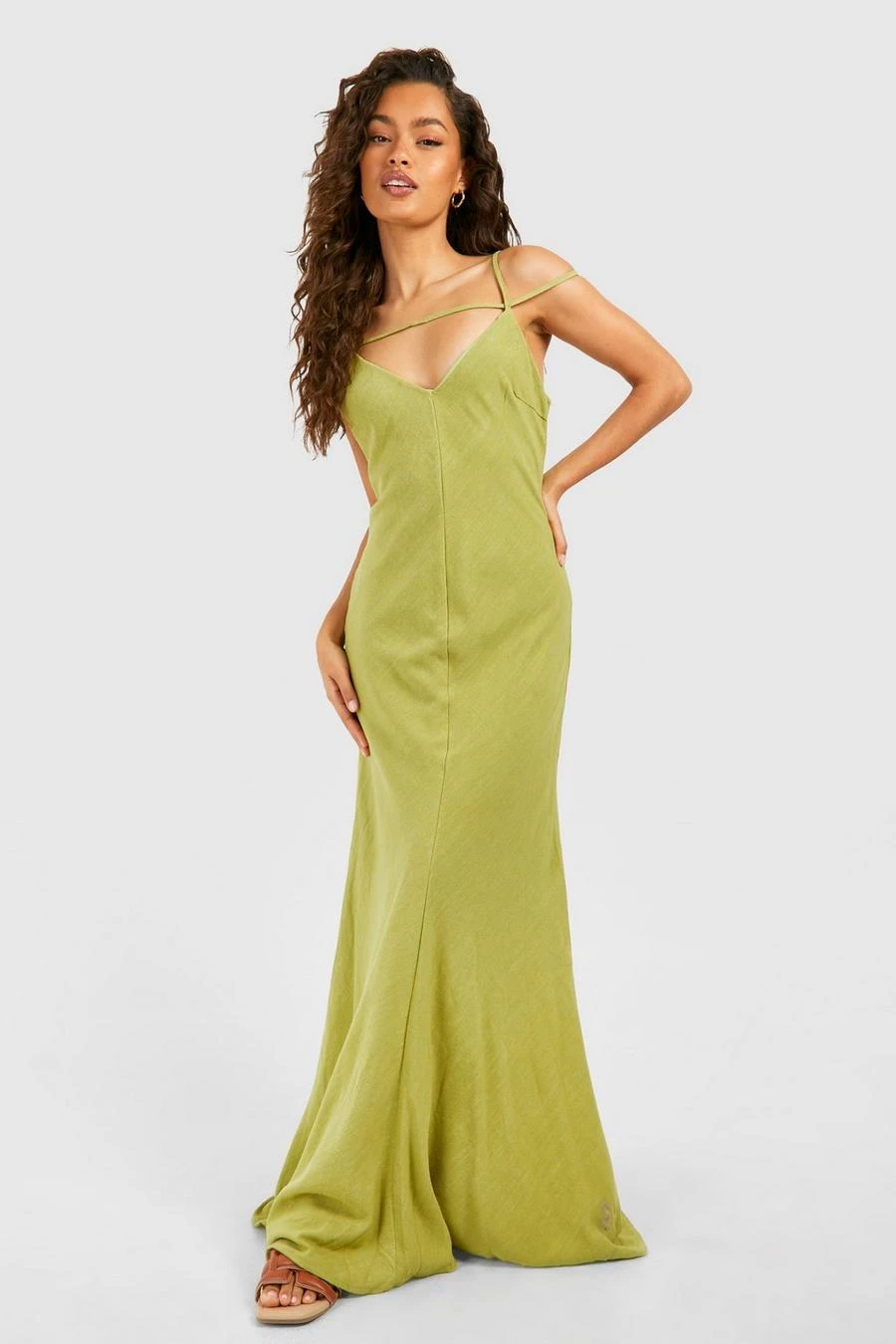 BOOHOO Linen Look Strappy Plunge Maxi Slip Dress