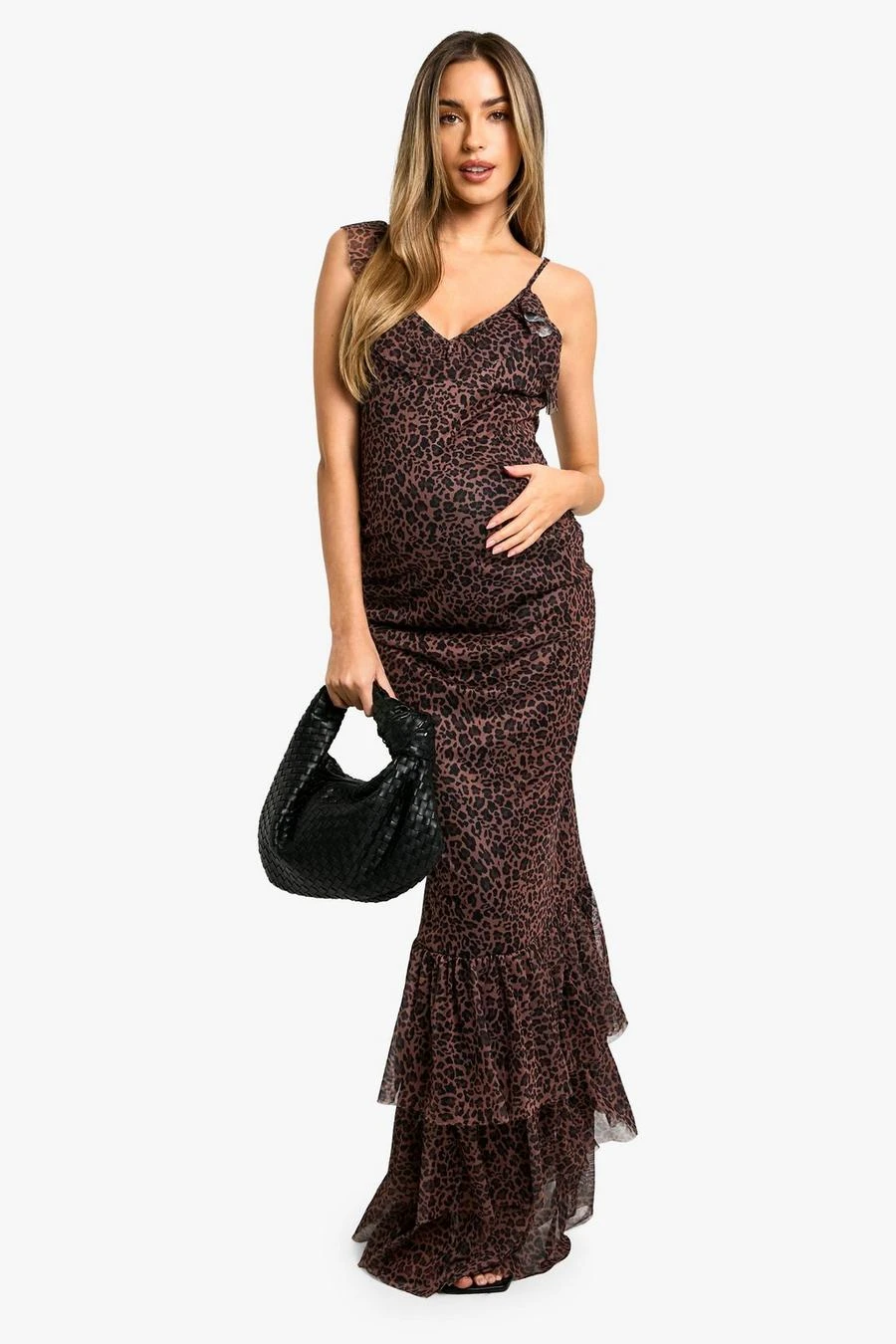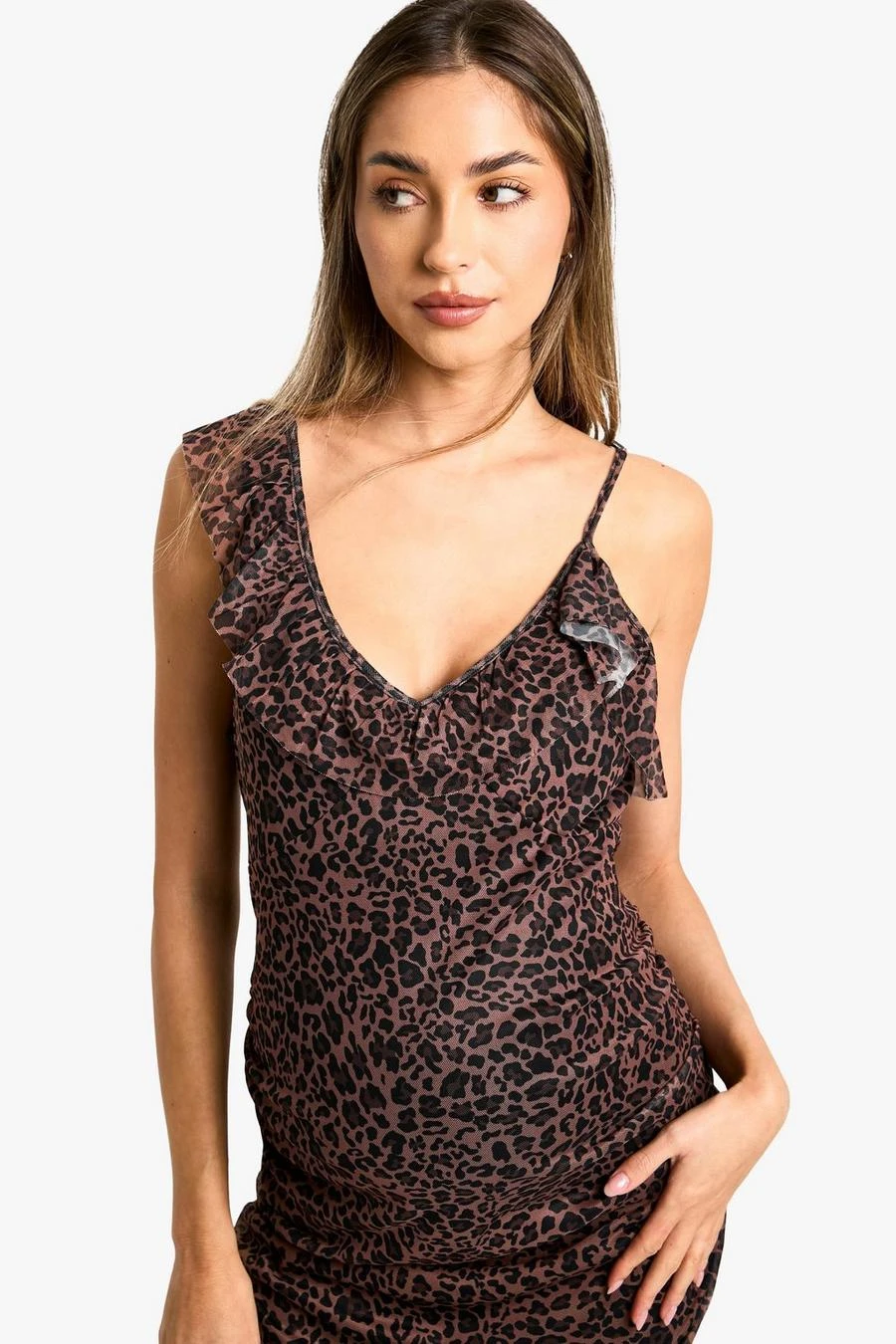 BOOHOO Maternity Leopard Print Mesh Ruffle Hem Detail Strappy Maxi Dress