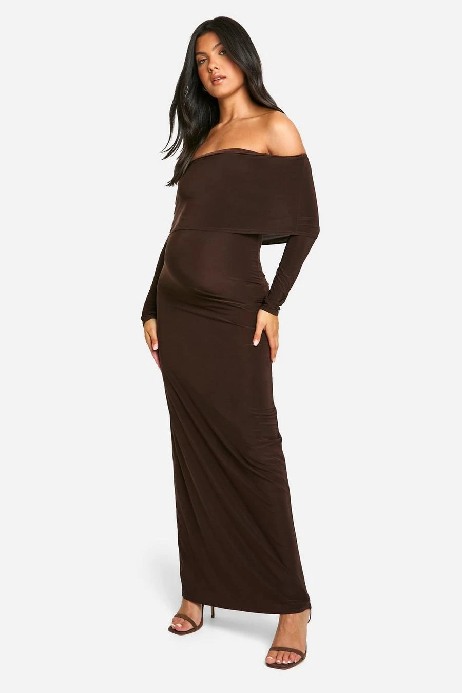 BOOHOO Maternity Slinky Deep Bardot Long Sleeve Maxi Dress