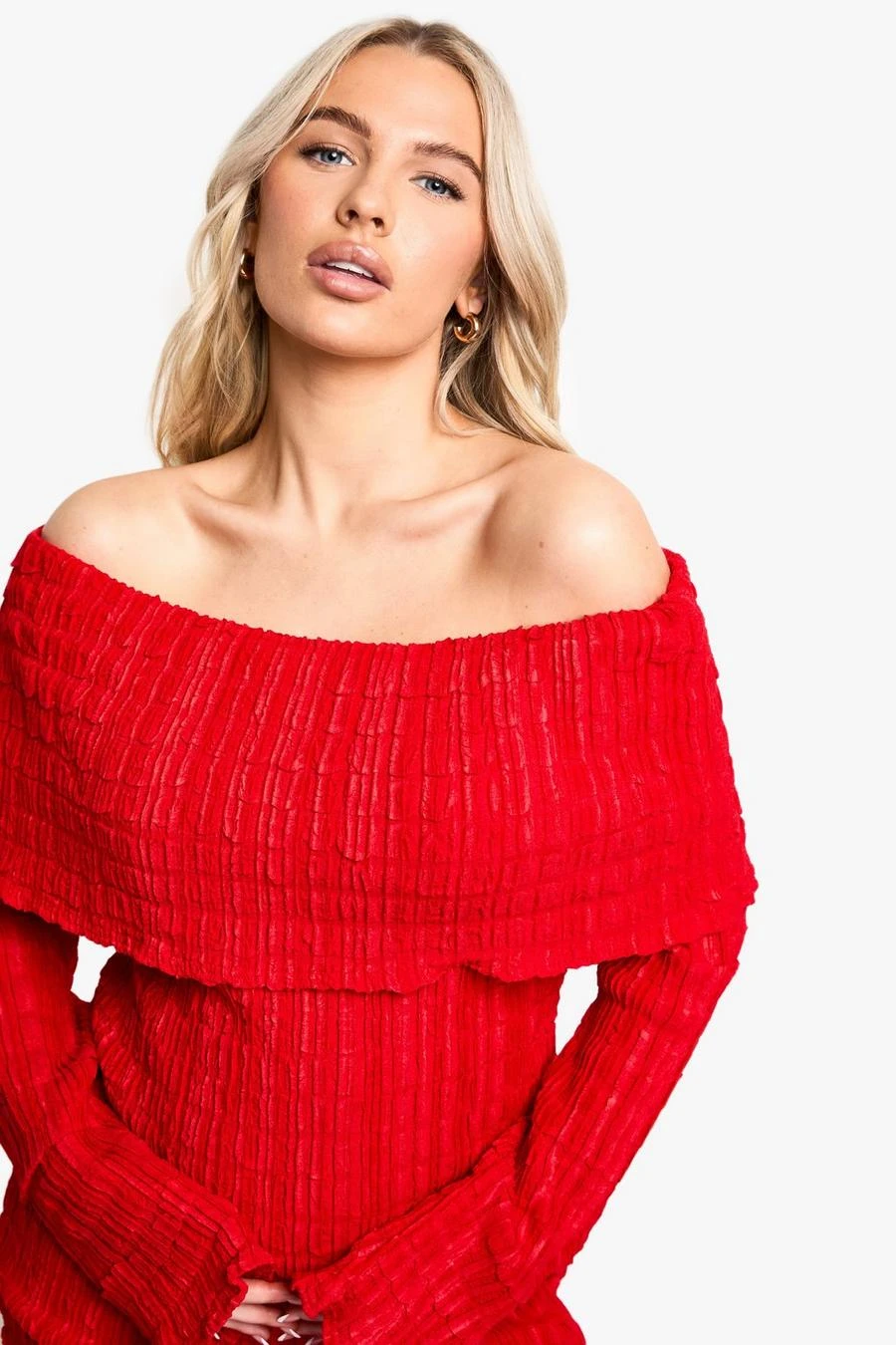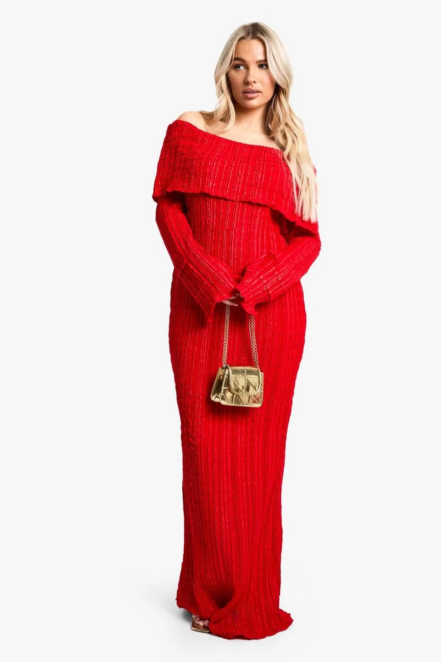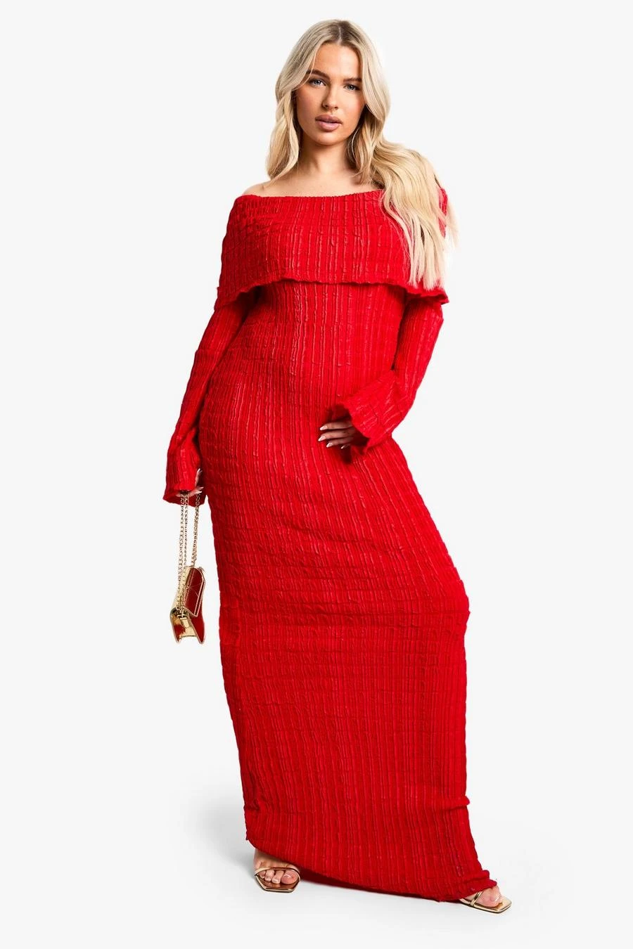 BOOHOO Maternity Textured Crinkle Bardot Long Sleeve Maxi Dress
